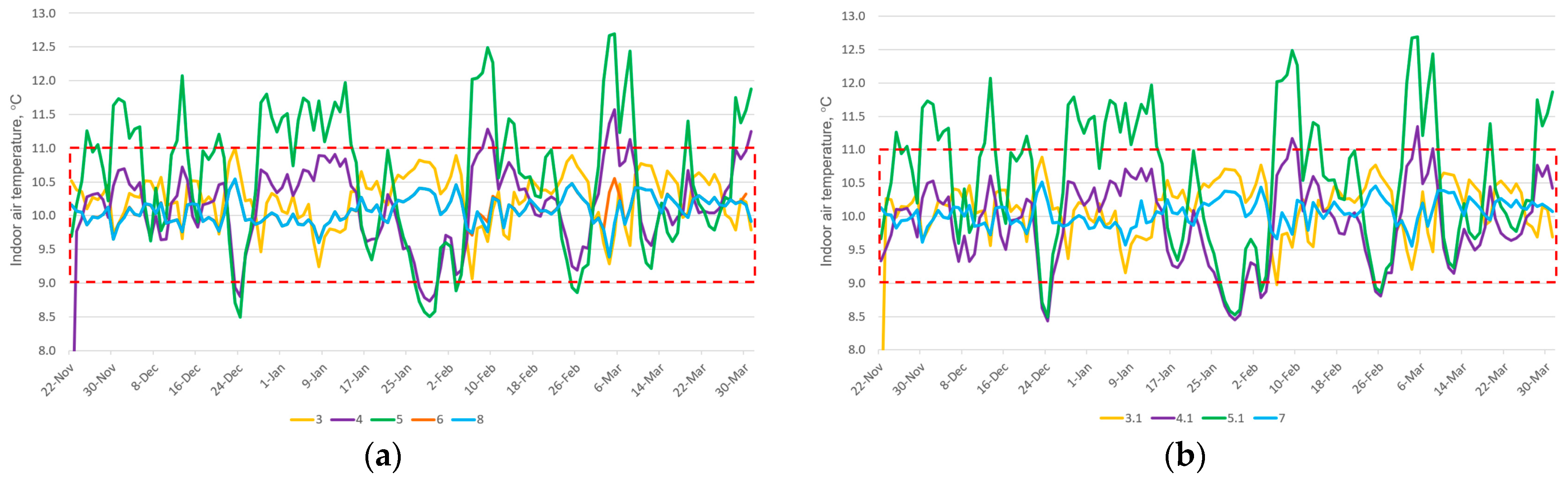 In terms of indoor air temperature (Figure 13), the best results were obtained for Variants 3 and 3.1 with the integrated system, and Variants 6, 7, and 8 with the separate system, in which 100% of the results fell within the recommended range. In the other integrated system Variants 4 and 4.1, 90% of the results were within the recommended range, while in Variants 5 and 5.1 only 57% complied. The conformity of indoor air temperature (t) results is summarised in Table 4. The most stable temperature profiles were observed in the separate system Variants 6, 7, and 8, with values ranging from 9.5 °C to 10.5 °C. In the integrated system Variants 3 and 3.1, temperatures fluctuated more widely, between 9 °C and 11 °C. Thus, it can be concluded that the separate system Variants 6, 7, and 8 provided the highest consistency in daily indoor air temperature results.