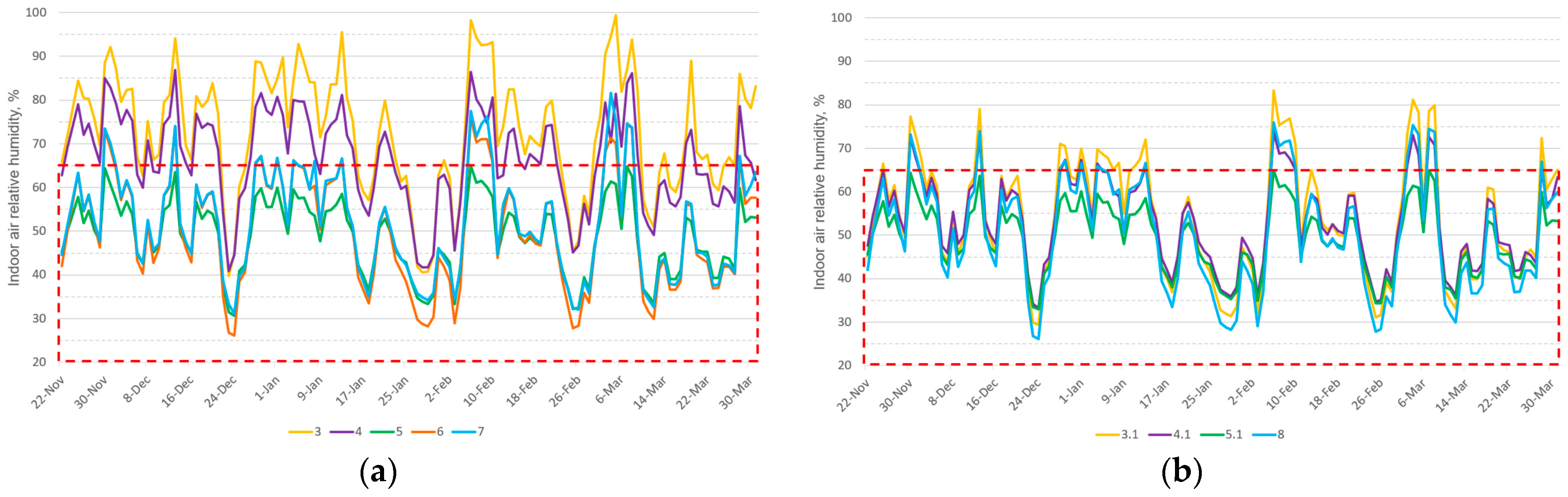 For the daily distribution of indoor air relative humidity (Figure 14), the most favourable results were obtained for Variants 5 and 5.1 with the integrated system, where 100% of the results remained below the recommended limit. In Variant 4.1 with the integrated system and in the separate system Variants 6, 7, and 8, 85% of the results complied with the recommendations. In the remaining integrated system Variants 3.1, 4, and 3, the proportions of results below the recommended value were 78%, 43%, and 29%, respectively. The conformity of indoor air humidity (RH) results is summarised in Table 4.