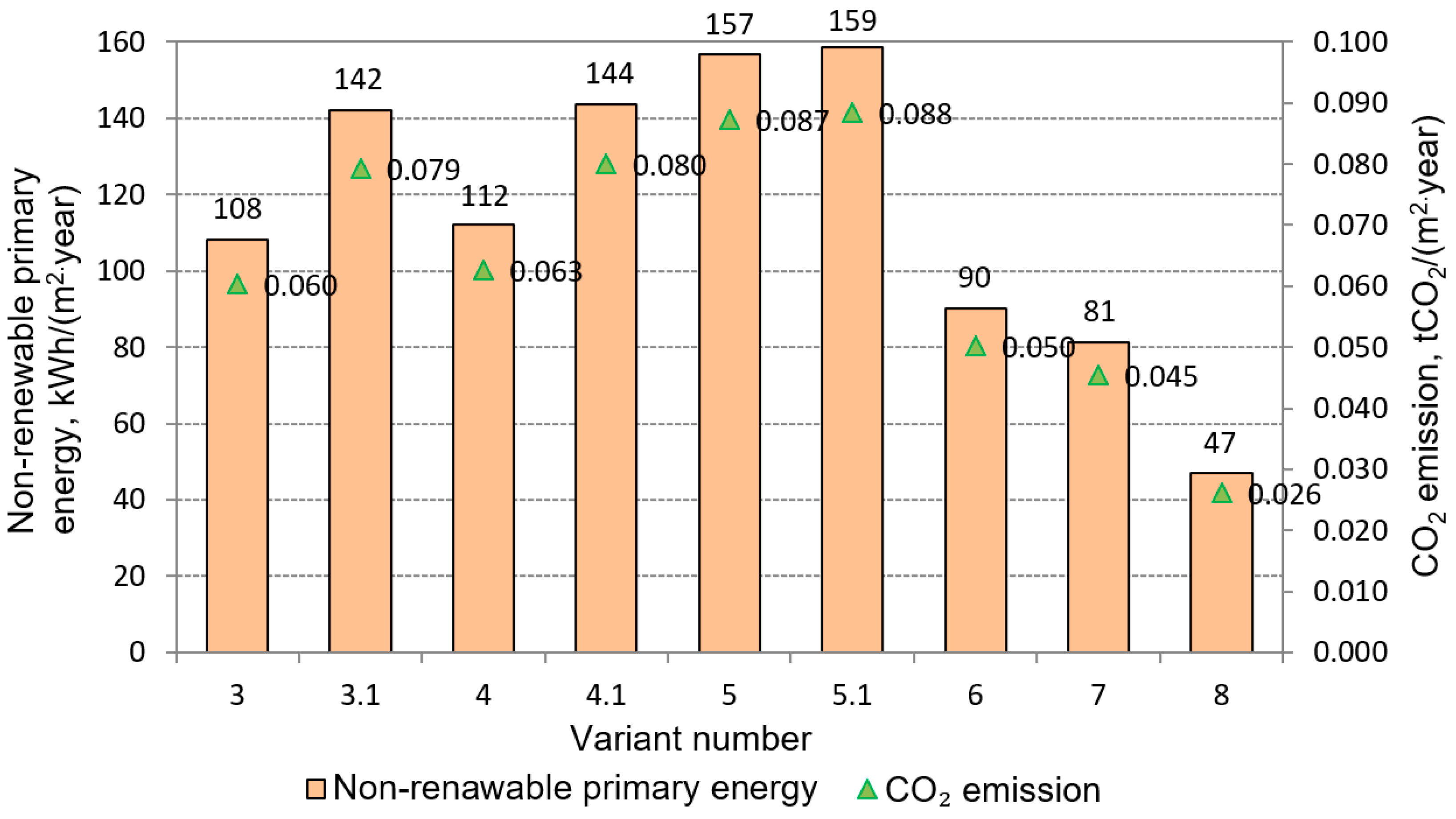 The primary energy demand for each variant was calculated using the non-renewable primary energy factors: wi = 0.8 for the preparation of the heating medium in the heating coil, and wi = 2.5 for the electricity required to power the fans [25]. The research focused solely on the environmental costs associated with the operation of the air handling units, without accounting for the energy consumption of other building systems. For the calculation of the CO2 emission for each variant the CO2 emission factor of 0.446 kg CO2/kWh was adopted for the heating system [26].