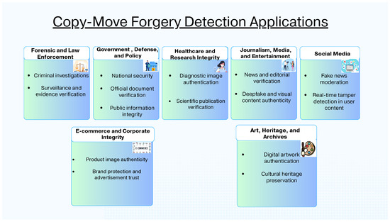 - Journalism, media and entertainment: In the media and entertainment sectors, CMFD is essential for ensuring the authenticity of published visuals, preventing misinformation, and maintaining audience trust. Recent studies have emphasized the importance of explainability and provenance tracking in journalistic contexts, leading to the integration of CMFD within blockchain-based verification systems and deepfake detection frameworks. For instance, hybrid CMFD–GAN detection systems have been adopted by several news agencies to validate both copy–move and synthetic image manipulations before publication. A lightweight CMFD model integrated into an editorial verification workflow achieved near real-time tamper localization, reducing verification time by 80% while maintaining interpretability, an essential requirement for editorial decision-making.