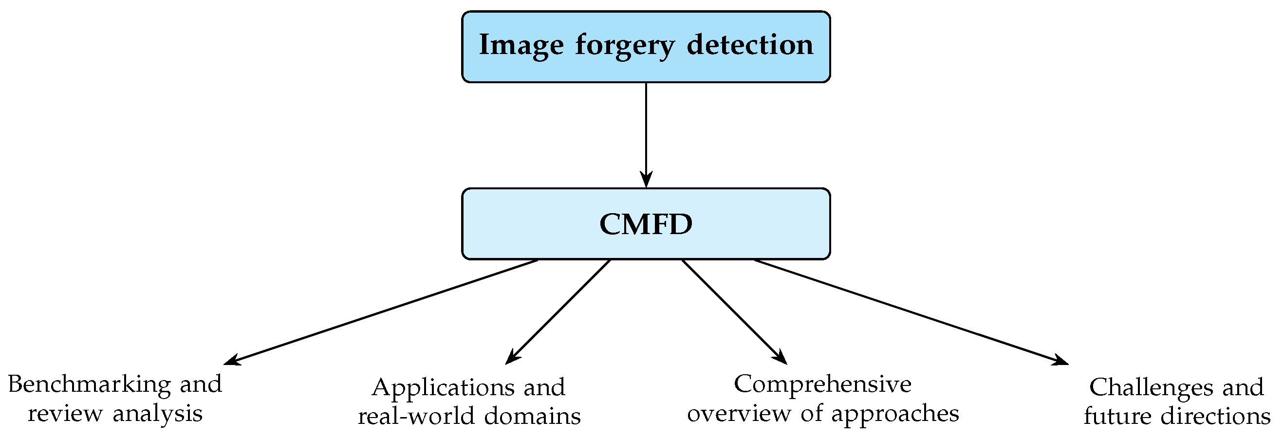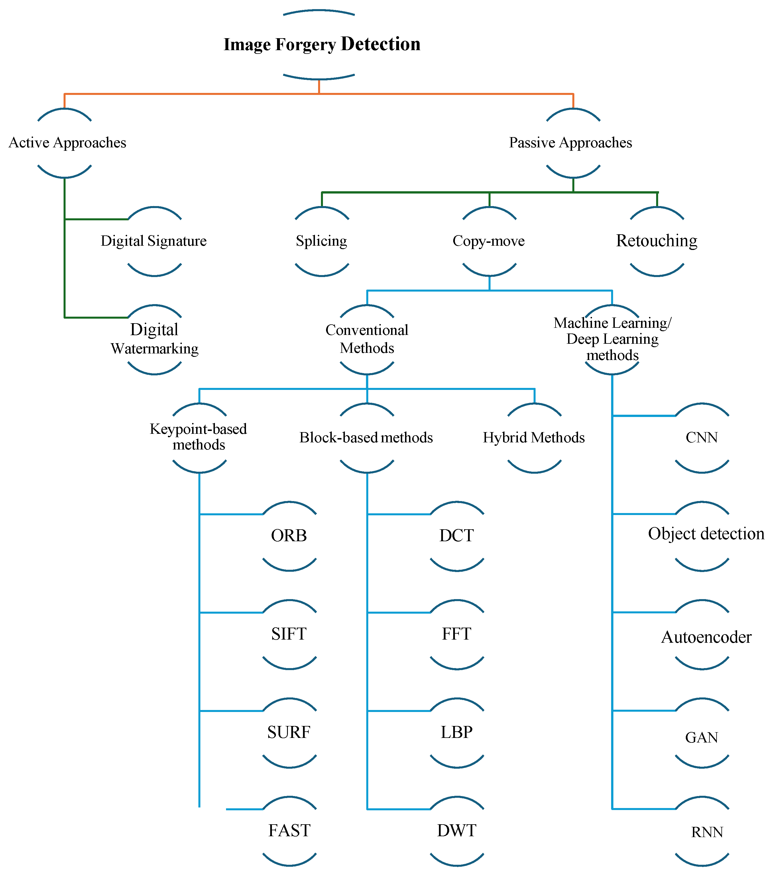 - Goel, A.; Chakraverti, A.K.; Gupta, K. A Comprehensive Analysis of Copy-Move Forgery Detection Method. In Proceedings of the 2025 4th OPJU International Technology Conference (OTCON) on Smart Computing for Innovation and Advancement in Industry 5.0, Raigarh, India, 9–11 April 2025; pp. 1–5. [Google Scholar]