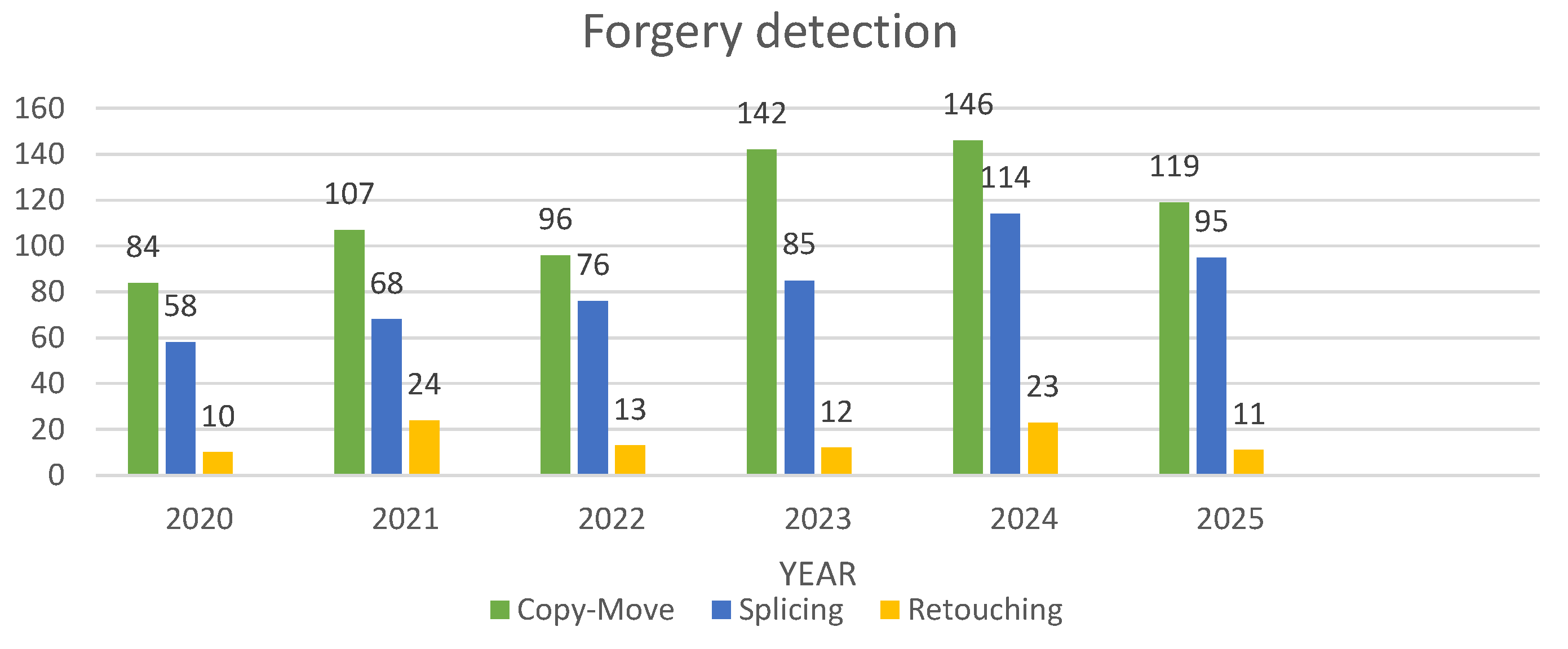 - Ethical and privacy considerations: The adoption of the CMFD technology raises important ethical and privacy questions. Misclassification could lead to reputational harm, false accusations, or censorship, especially in journalism or legal contexts. To mitigate these risks, CMFD systems must incorporate explainability mechanisms that allow transparent interpretation of detection results. Collaborations with ethicists and policymakers are also required to establish responsible AI guidelines, ensuring fair and accountable use of image forensics technologies.