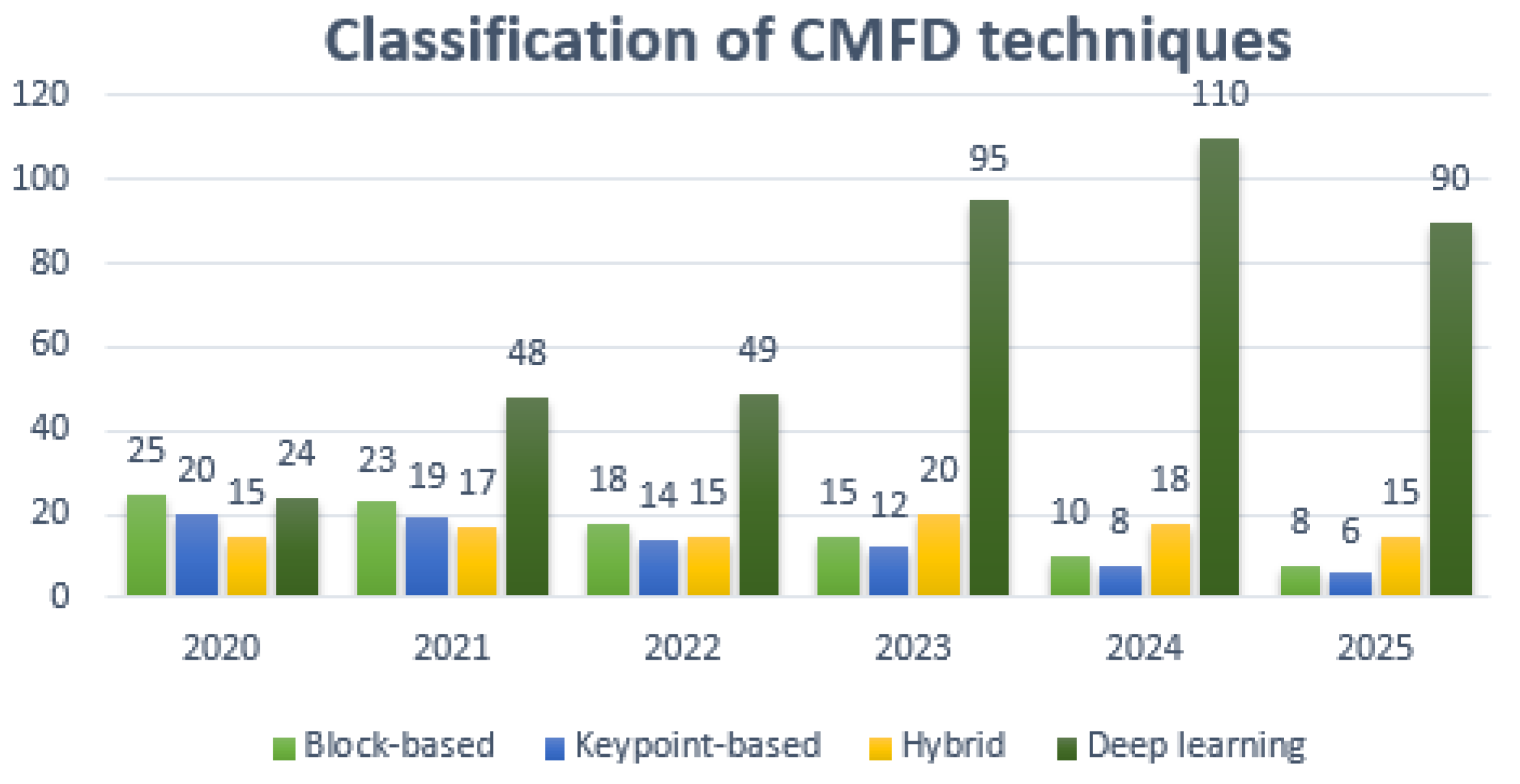 - We present a comprehensive and structured survey of CMFD techniques, encompassing traditional (block-based and keypoint-based) and hybrid approaches, along with recent deep-learning-based models.