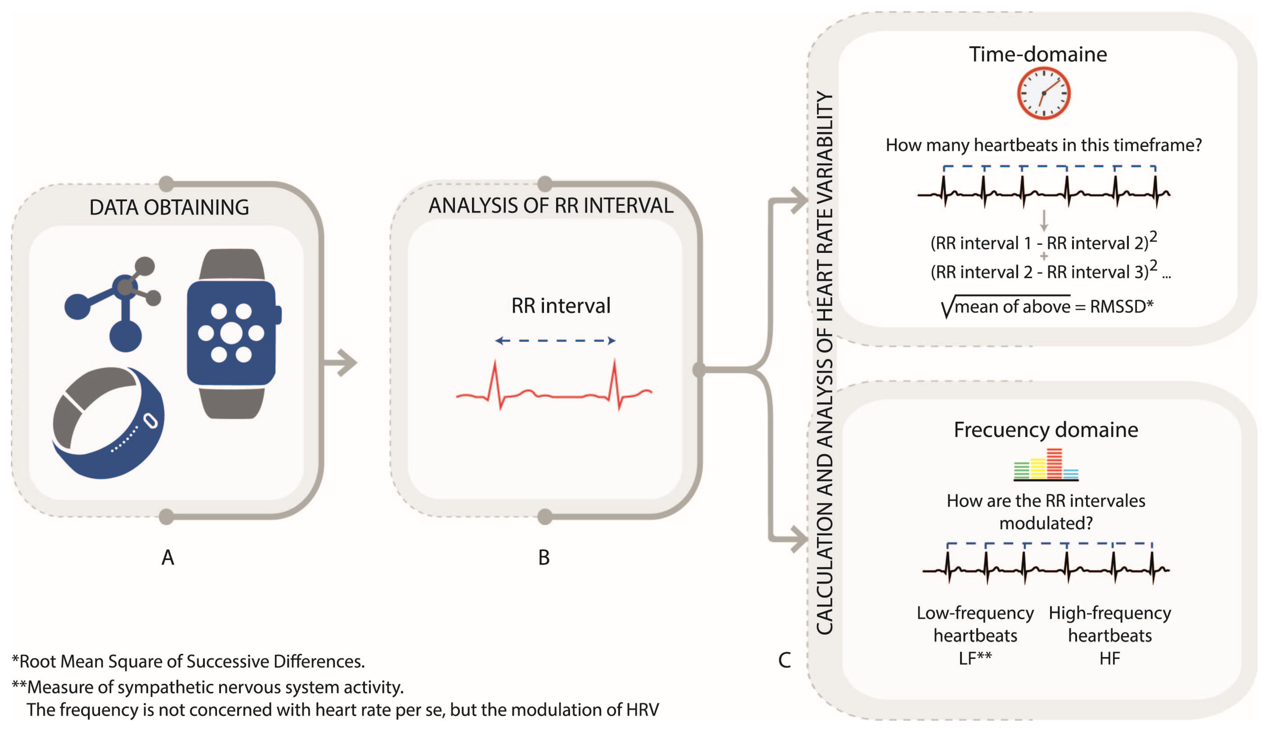 Figure 3. Heart rate variability (HRV) analysis via PPG and RR Intervals. (A). Data obtain. (B). Analysis of RR interval. (C). Calculation and Analysis oh heart rate variability Author’s own figure.