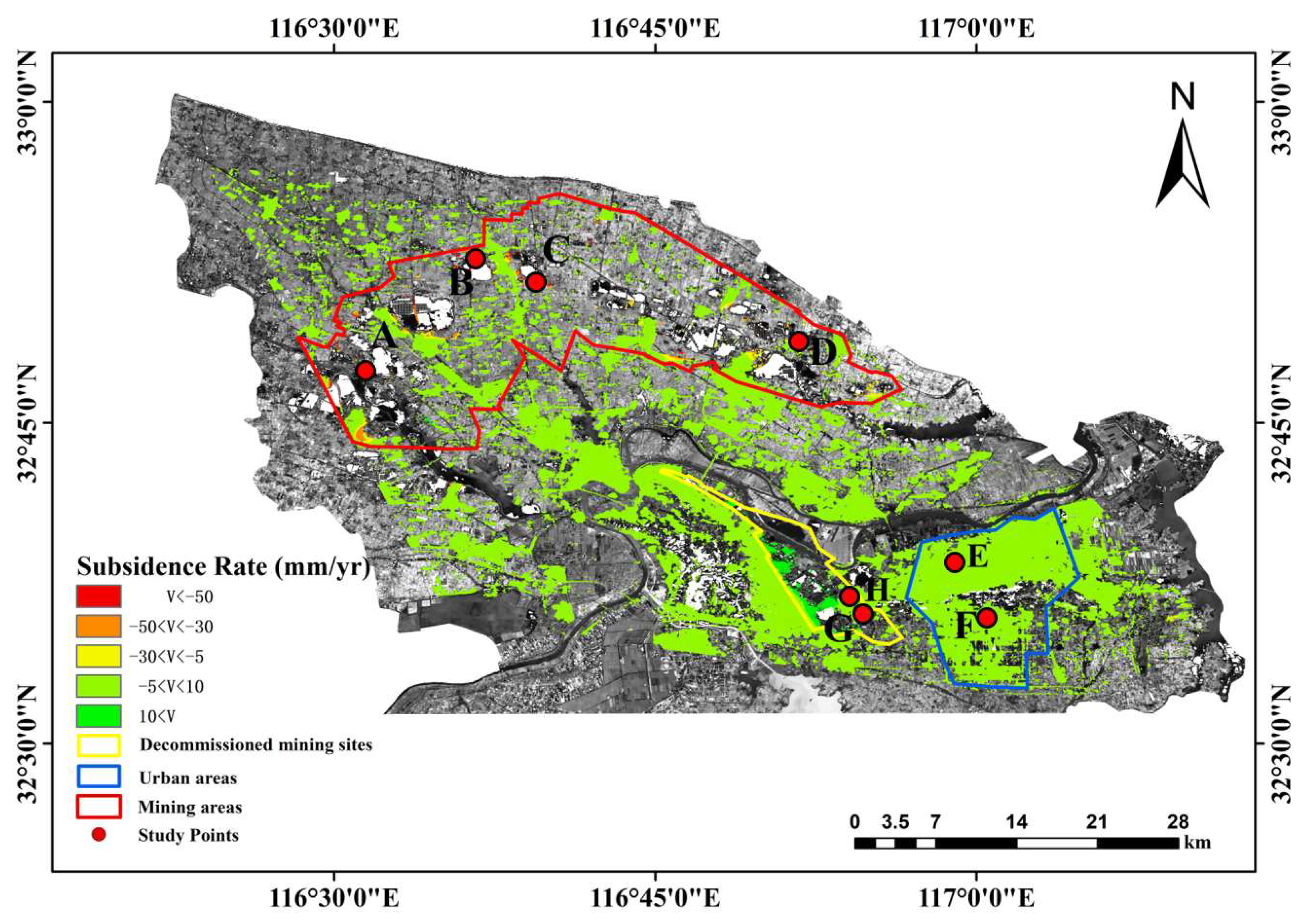 - Li, D.; Deng, K.Z.; Gao, X.X.; Niu, H.P. Monitoring and analysis of surface subsidence in Mining areas based on SBAS-InSAR. Geomat. Inf. Sci. Wuhan Univ. 2018, 43, 1531–1537. [Google Scholar] [CrossRef]