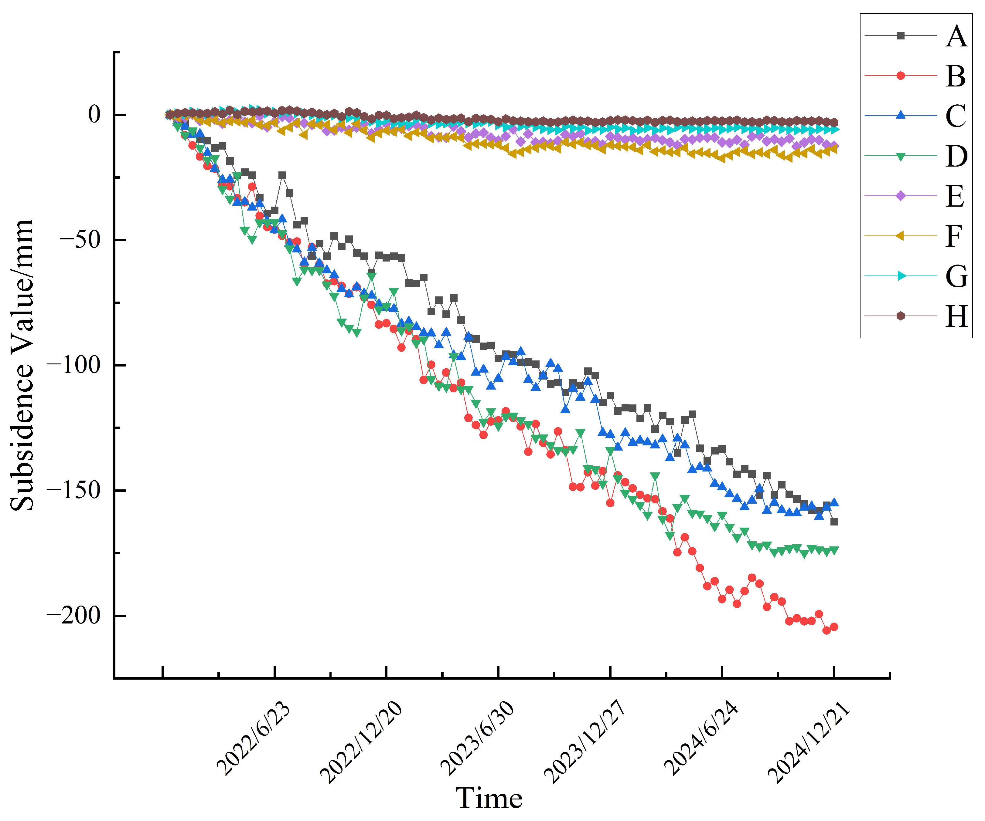 - A comparison of the LSTM–Transformer model’s predictions with the actual data demonstrates a high degree of consistency, highlighting the model’s strong predictive performance and reliability. The integration of SBAS-InSAR technology with the LSTM–Transformer model not only enhances the accuracy of surface settlement monitoring and prediction but also provides a solid scientific foundation and technical support for early warning and mitigation of settlement-related disasters.