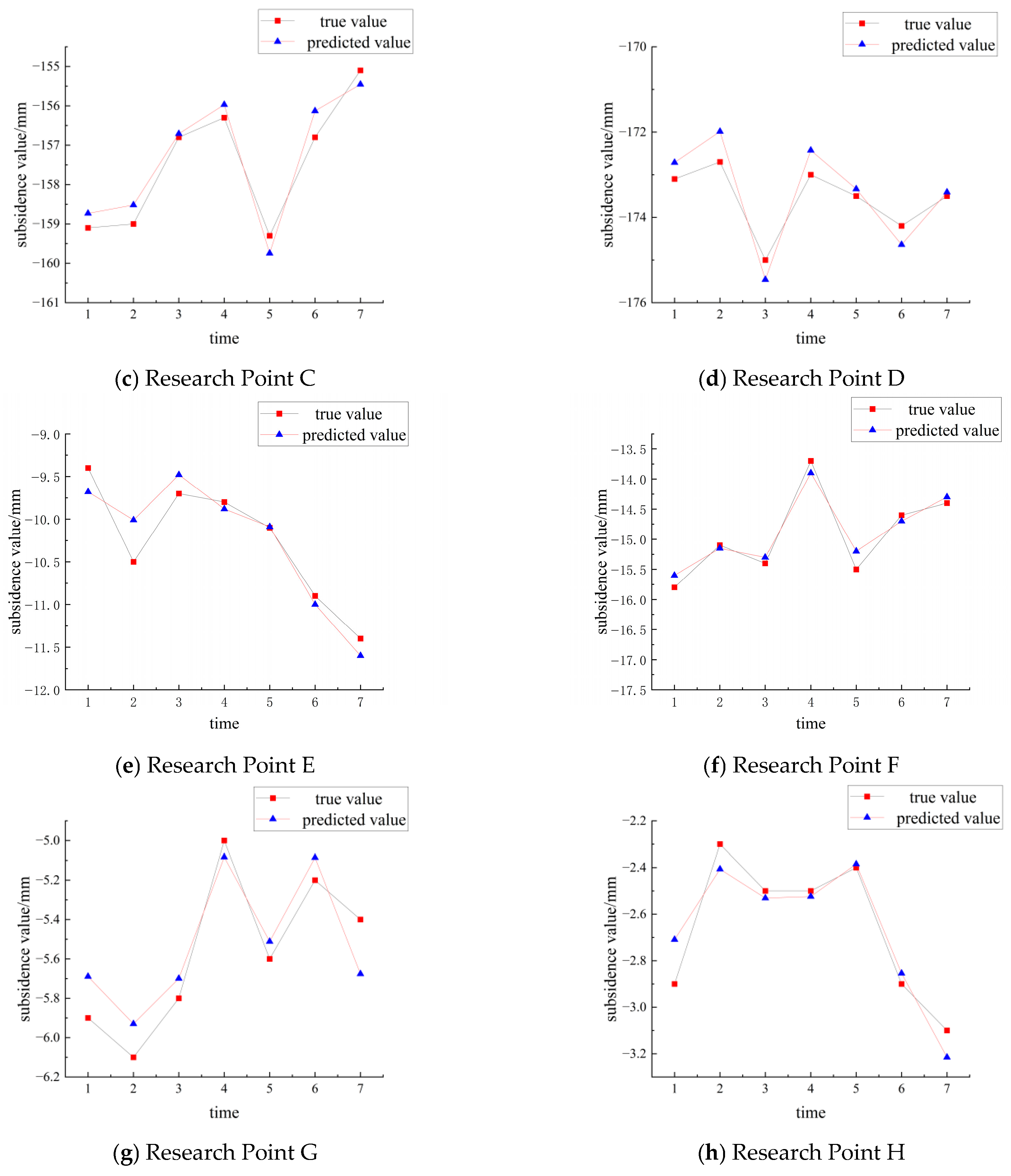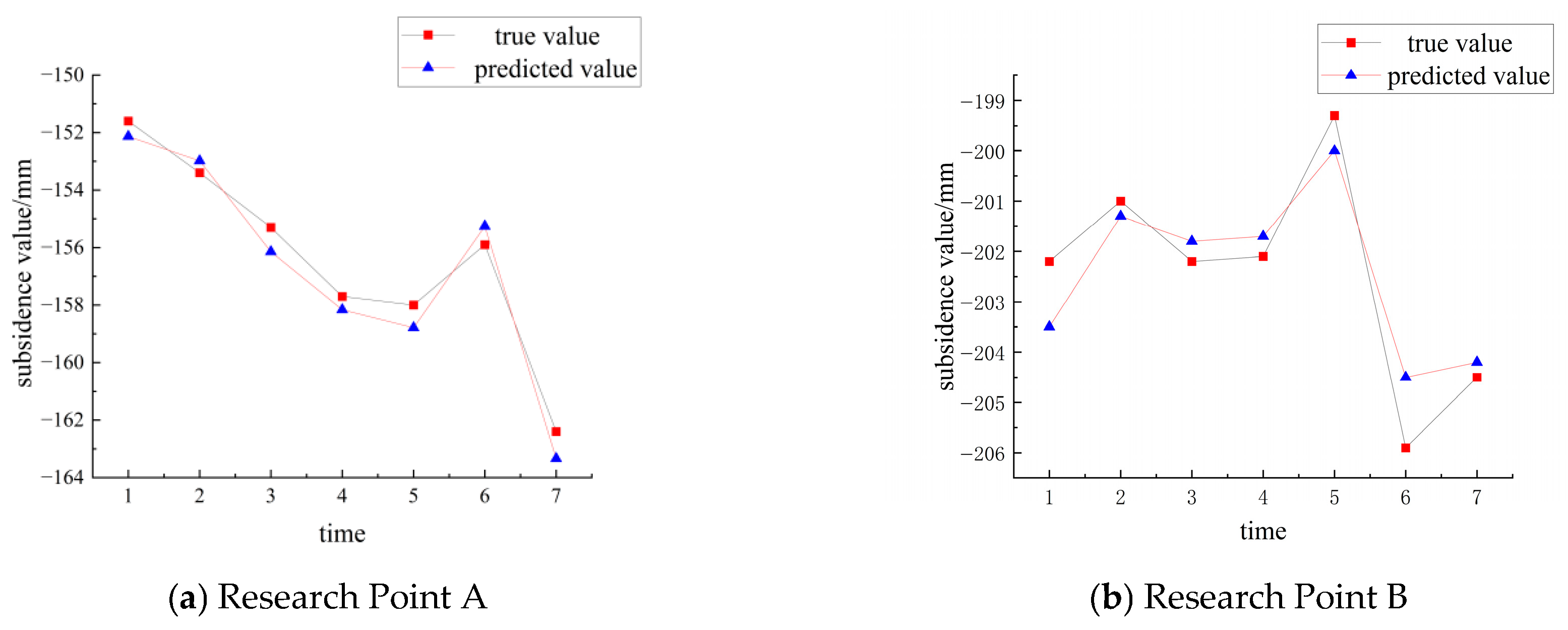 - By utilizing time-series settlement data obtained through SBAS-InSAR technology, effective classification and management of the mining area, urban area, and decommissioned mining sites were achieved, providing a solid data foundation for differentiated modeling. The LSTM–Transformer model demonstrated high accuracy in predicting settlement across all three areas, with the RMSE consistently maintained between 1 and 2 mm. These results underscore the feasibility and practical application of this method in the fine monitoring and prediction of surface settlement.
