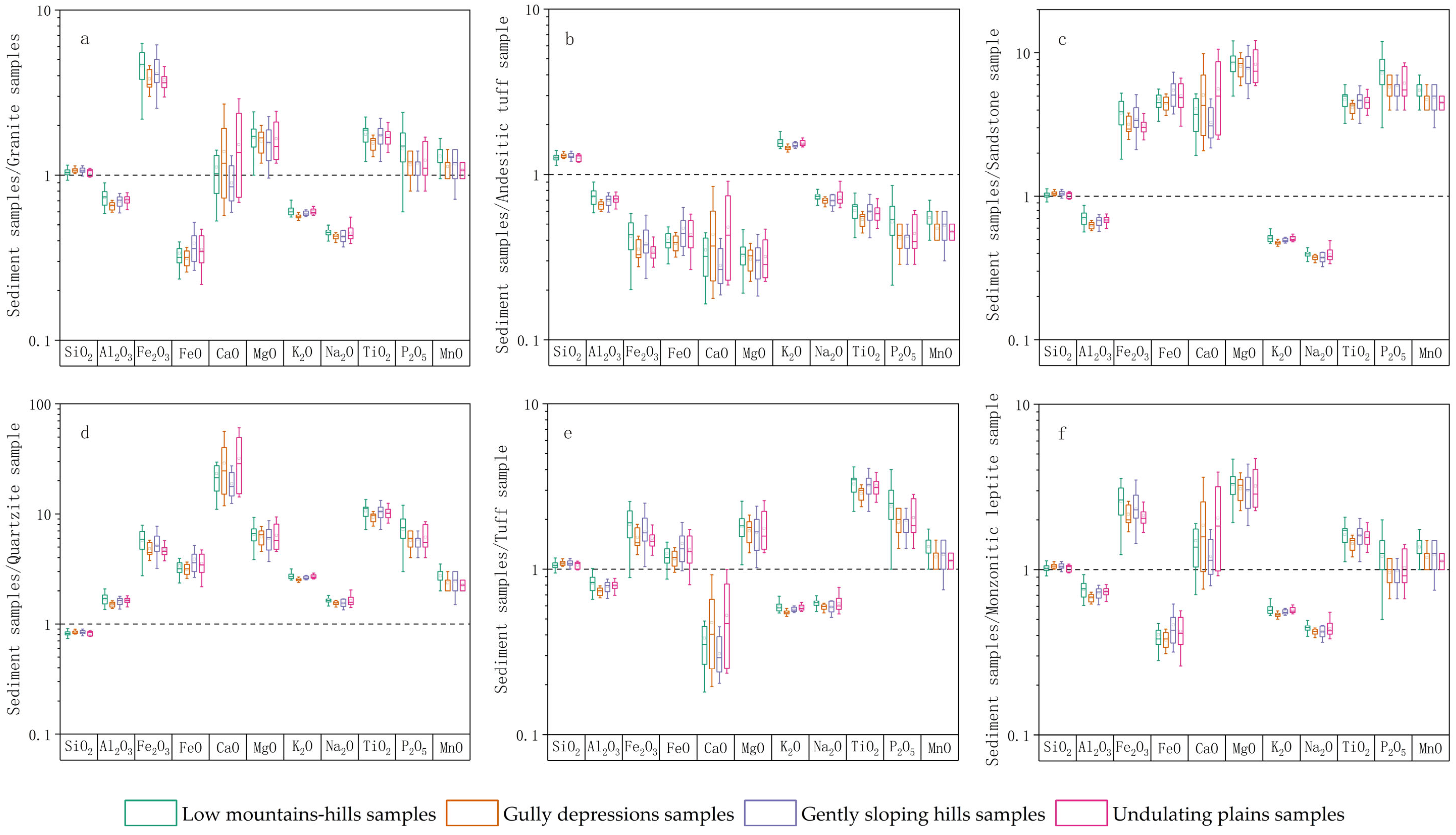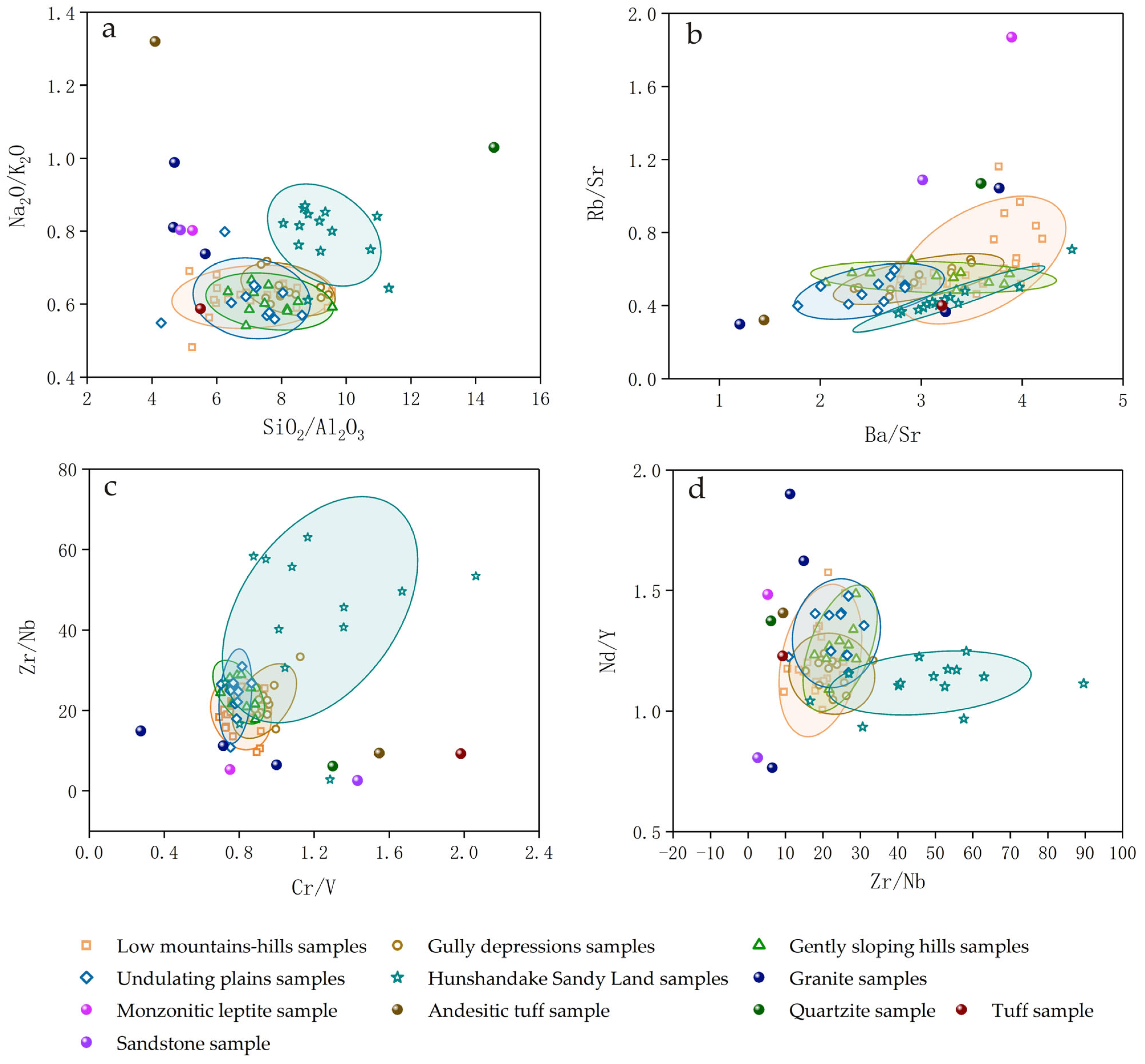 - Liu, L.; Xie, Y.Y.; Chi, Y.P.; Kang, C.G.; Wu, P.; Wei, Z.Y.; Zhang, Y.X.; Zhang, M. Geochemical compositions of the Onqin Daga Sand Land and Horqin Sand Land and their implications for weathering, sedimentation and provenance. Mar. Geol. Quat. Geol. 2021, 41, 192–206. [Google Scholar]