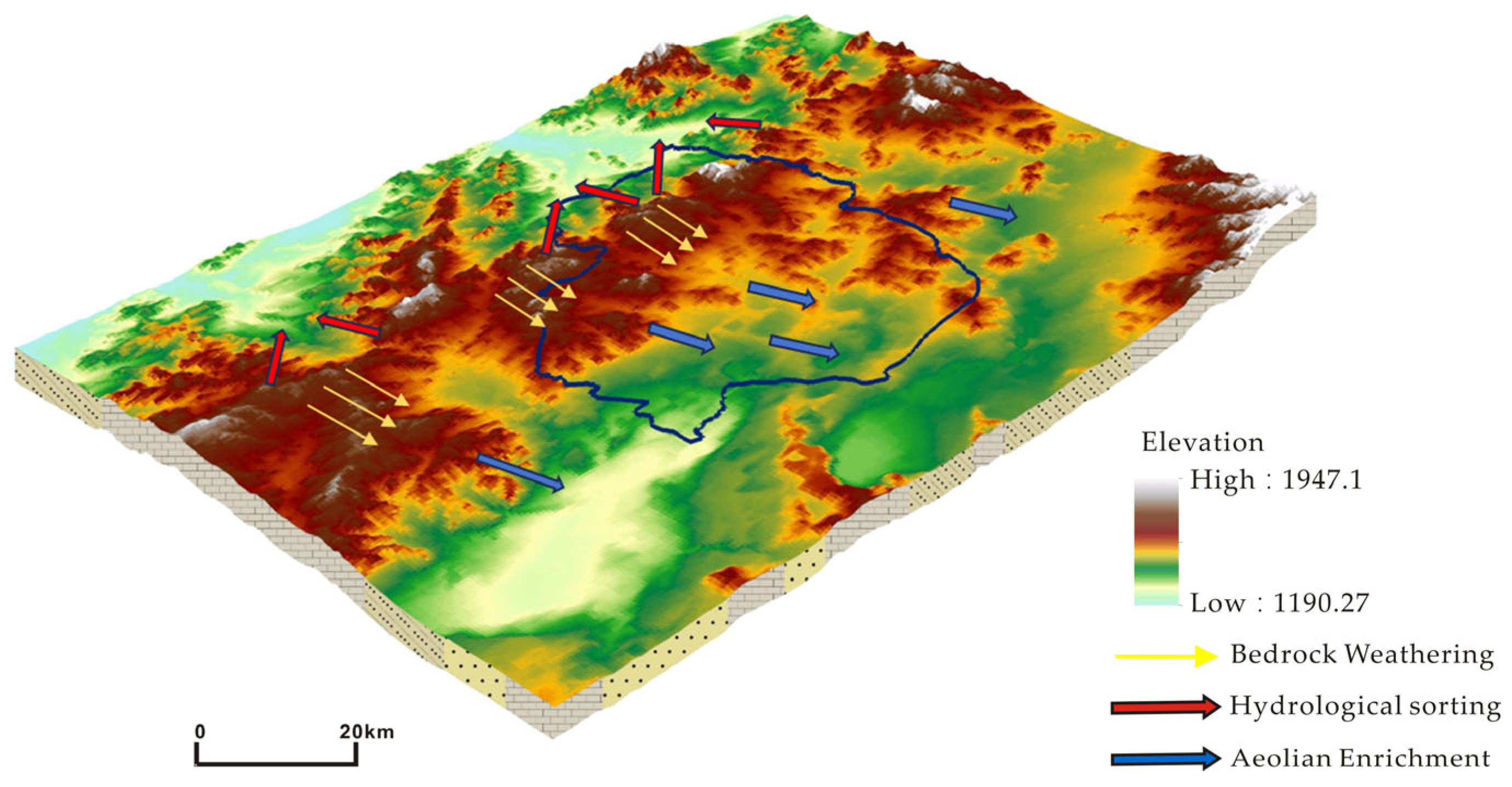 5.1. Dominance of Bedrock Provenance and Its Geomorphic Modification