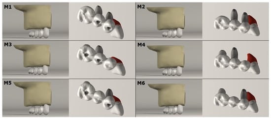Finite element models illustrating implant locations and prosthetic configurations for each group. M: Abbreviation for model.