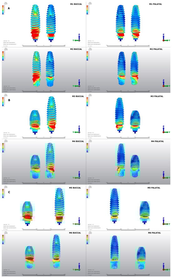 (A) Von Mises stress distributions (MPa) for implants in models M1–M2 (distal cantilever). (B) Von Mises stress distributions (MPa) for implants in models M3–M4 (mesial cantilever). (C) Von Mises stress distributions (MPa) for implants in models M5–M6 (pontic). M: abbreviation for model.