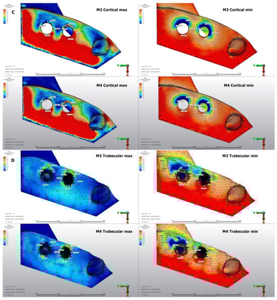 Regarding cortical bone, the maximum principal stresses were 7.25 MPa for Model 3 and 6.31 MPa for Model 4, occurring at the palatal collar of the 2PM implant. The minimum principal stresses were 12.43 MPa in Model 3 (at the distal collar of the 1M implant) and 13.20 MPa in Model 4 (at the buccal collar of the 1M implant). In trabecular bone, the maximum and minimum principal stresses were 1.17 MPa and 0.85 MPa, respectively, in Model 3 (at the mesio-buccal collar of the 2PM implant), and 1.36 MPa and 1.05 MPa in Model 4 (disto-buccal collar of the 1M implant).