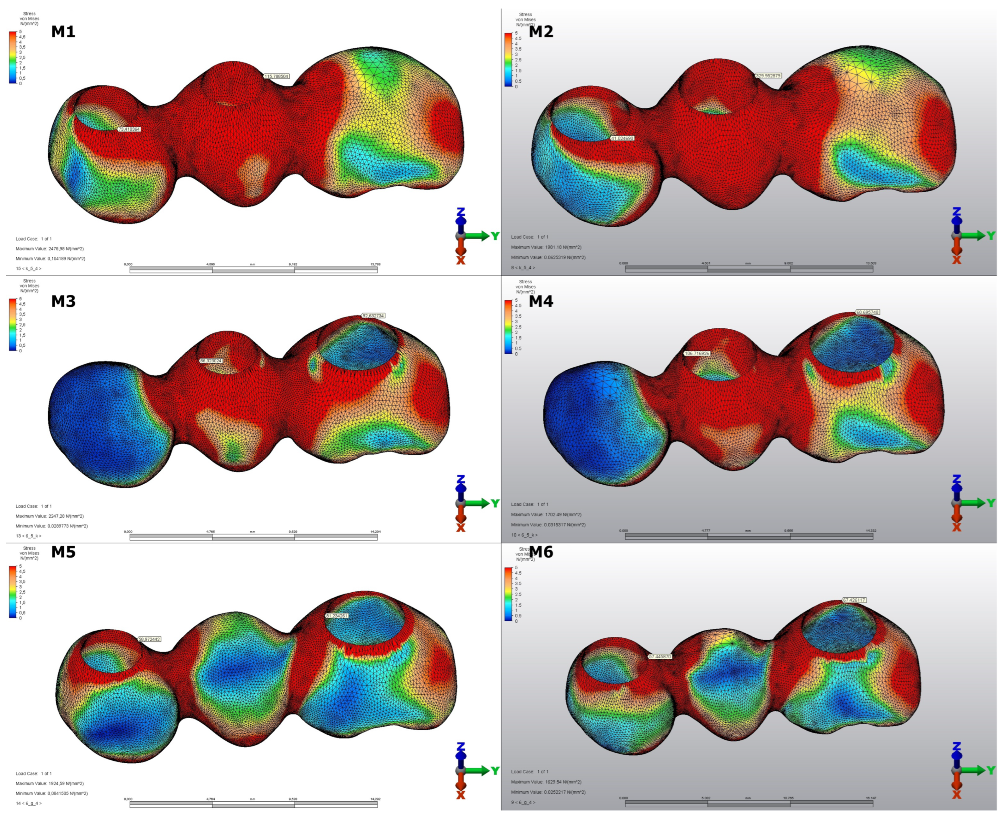 - Cláudia, L.B.B.; Marcelo, F.M.; Daniel, T.K.; Pedro, Y.N.; Rafael, L.X.C.; Valentim, A.R.B. Comparison between all-on-four and all-on-six treatment concepts and framework material on stress distribution in atrophic maxilla: A prototyping guided 3D-FEA study. Mater. Sci. Eng. C Mater. Biol. Appl. 2016, 1, 715–725. [Google Scholar]