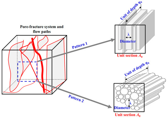 As for the structure of the coal, it usually contains a coal matrix, porous structure, and fracture structure; the fracture system will have a great impact on the deformation process and permeability evolution [24,25]. The pore-fracture system usually presents an obvious fractal characteristic [22]. Developing the coal permeability model from the perspective of fractal theory is a worthy way to try. There are at least two kinds of fractal dimension for the coal pore-fracture system. One is the fractal dimension of the distribution of pore-fracture aperture (the diameter of capillary flow), which is noted as δ. Another is the fractal dimension of tortuous curved trace of fluid flow in pore structure, which is noted as D. Specifically, δ reflects the variability and scaling behavior of fracture apertures observed in three-dimensional CT (Computed Tomography) reconstructions, while D quantifies the curvature and connectivity of the fracture network derived from the tortuous flow traces. When it comes to the coal fracture media, even for the same fracture aperture λ, the length of fracture depth perpendicular to the macro seepage direction of the fracture is also different. In order to solve this problem, two patterns are usually used to be equivalent to the fracture medium (as shown in Figure 1): (1) the fracture medium is equivalent to the parallel plate with the fracture aperture of λ, and all the fracture depths of unit section A0 are converted into unit depth; (2) the fracture medium is equivalent to the capillary with a diameter of λ.
