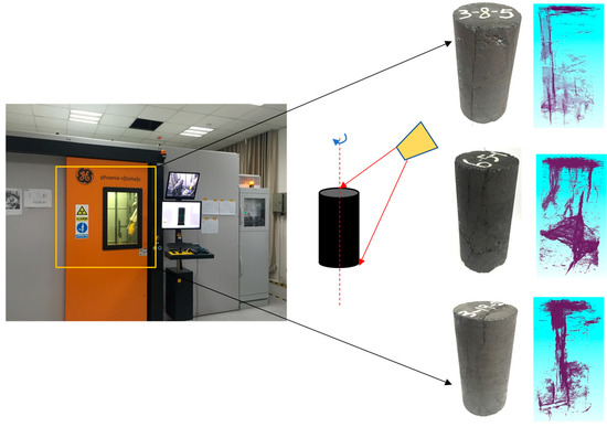 Schematic view of fractured coal samples and the reconstruction results of fracture network by CT scanning test (revised from reference [5]).