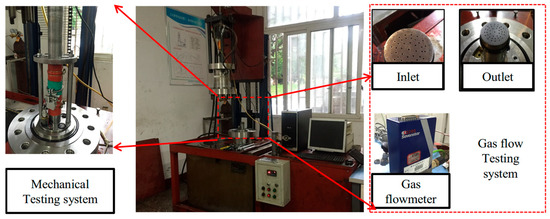 As shown in Figure 4, the multi-field coupling seepage system was employed to perform coal gas flow experiments. This system can apply controlled stress, gas pressure, and temperature conditions, while continuously monitoring gas flow dynamics throughout the deformation process. The setup is capable of applying axial stress and confining pressure up to 100 MPa and 10 MPa, respectively, while measuring axial displacement and confining deformation up to 60 mm and 6 mm. The maximum axial displacement and confining deformation can be 60 mm and 6 mm. The control accuracy is ±0.5% of the reading, with a test accuracy of ±1% of the reading. The temperature control range is from room temperature to 100 °C, and the temperature was maintained at room temperature during this study. The data acquisition frequency was set to 1 sample per second. The gas type belongs to CH4, and the maximum gas pressure can reach 6 MPa. Experiments were conducted under axial loading controlled by either force or displacement, with all relevant parameters such as stress, strain, gas pressure, and flow rate being automatically acquired. Owing to the flow capacity of the fractured coal specimen being much larger than that of the intact one, a large flowmeter with a range of 0~10 L/min was used to avoid the condition that the flow rate exceeds the maximum testing range.