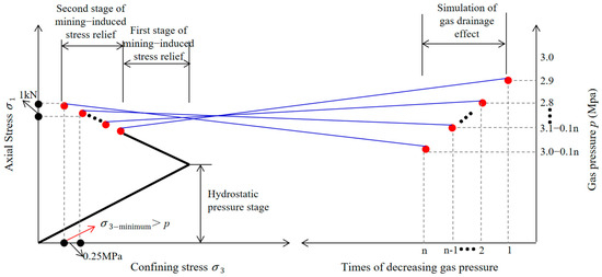 In laboratory investigations related to the simultaneous extraction of coal and gas, the evolution of mining-induced stress is typically simplified by gradually increasing the axial pressure while decreasing the confining pressure [34], thereby approximating the stress evolution process that occurs as the mining face advances. In actual mining operations, gas drainage techniques are commonly implemented to take advantage of the permeability enhancement resulting from stress relief. Consequently, modeling conditions that incorporate both stress relief and gas release can more accurately reproduce the complex in situ environment of combined coal and gas mining. In this manuscript, in order to further simulate the combination effect of mining pressure relief and gas release in the laboratory, the role of coal gas diffusion is ignored, and the gas release effect is simplified as the gas pressure reduction in the process of pressure relief. The experiment scheme is shown in Figure 5. The confining pressure of all coal specimens is set as 8 MPa, and the initial gas pressure is set at 3 MPa.