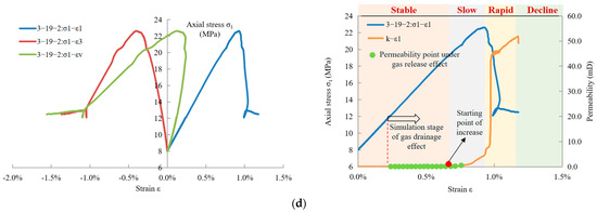 As shown in Figure 6, the mechanical response and deformation of the fractured coal specimen under mining-induced stress relief and gas release are presented (excluding residual strain from pre-fracturing). The results indicate a distinct difference in mechanical behavior between the combined effect of mining pressure relief with gas release and mining-induced stress relief alone. Generally, most of the coal specimens showed some obvious post-peak characteristics after axial deformation control was achieved, which resulted in an obvious volume expansion phenomenon. However, the volume expansion under the superposition condition is smaller than that under the mining-induced stress relief condition, and there was no obvious peak deformation platform. This phenomenon can be attributed to two primary factors: (1) from the perspective of the experimental conditions, the stress peak value changes from force control to axial displacement control in the laboratory simulation of the superposition condition, and the deformation rate of the whole coal specimen is relatively low, which cannot form the effect of rapid circumferential expansion deformation under loading condition of axial force control, and would result in a low probability of significant volume expansion deformation in a short time; (2) regarding the internal deformation mechanism, the expansion effect of gas adsorption can increase the deformation ability of coal samples to a certain extent. However, the gas in the coal will gradually desorb, escape, and migrate under the action of release, and the effective confining pressure will gradually increase under the same stress state. Then, the deformation capacity will become weak and the coal specimen is more likely to suddenly lose stability during the stage of peak stress, and finally, the probability of forming the peak deformation platform is smaller.