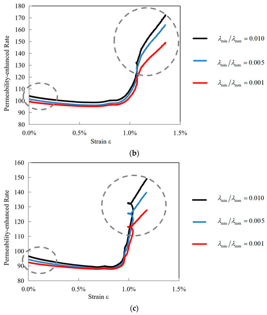 The evolution of permeability-enhanced rate with different values of the λmin/λmax. (a) Fractured coal specimen 1 (3-8-5); (b) Fractured coal specimen 2 (6-5-1); (c) Fractured coal specimen 3 (3-19-2).
