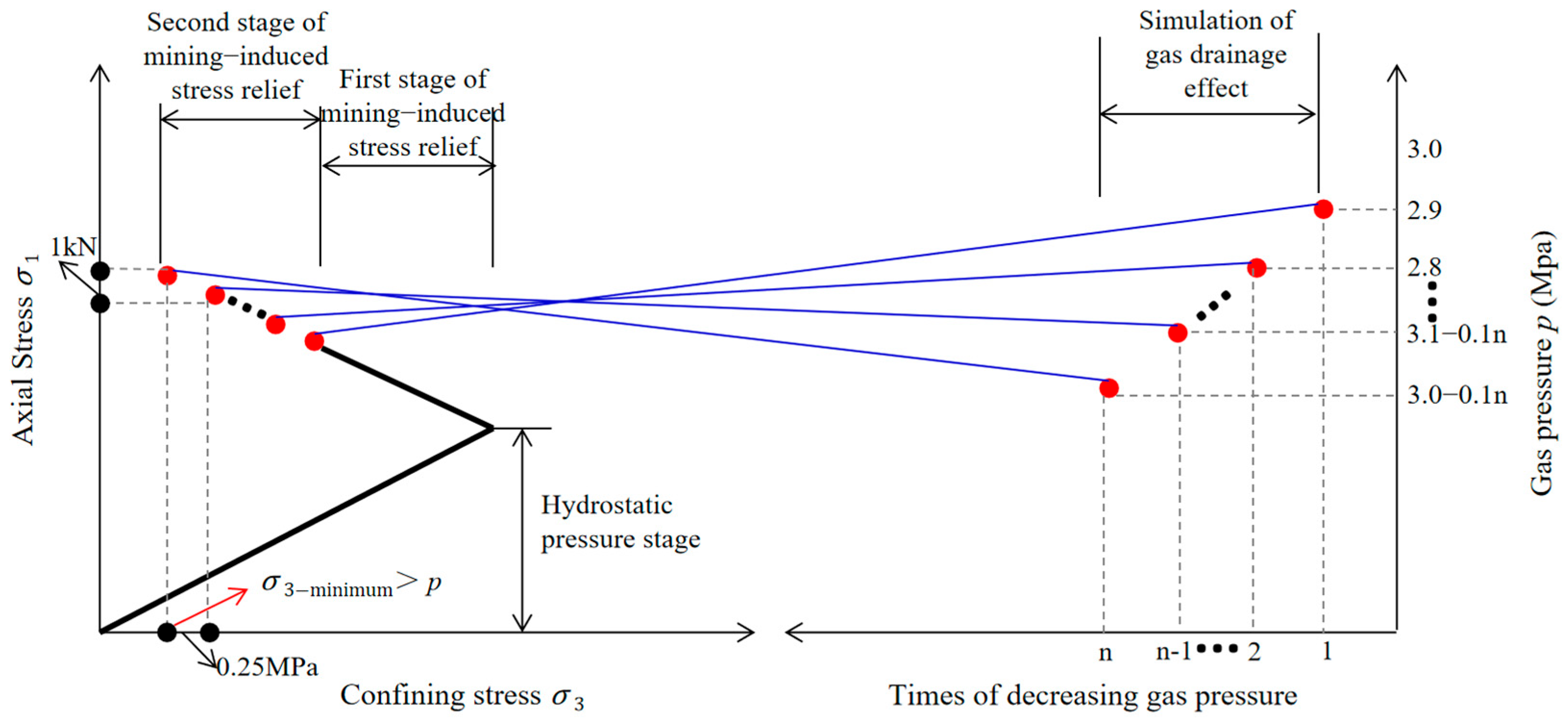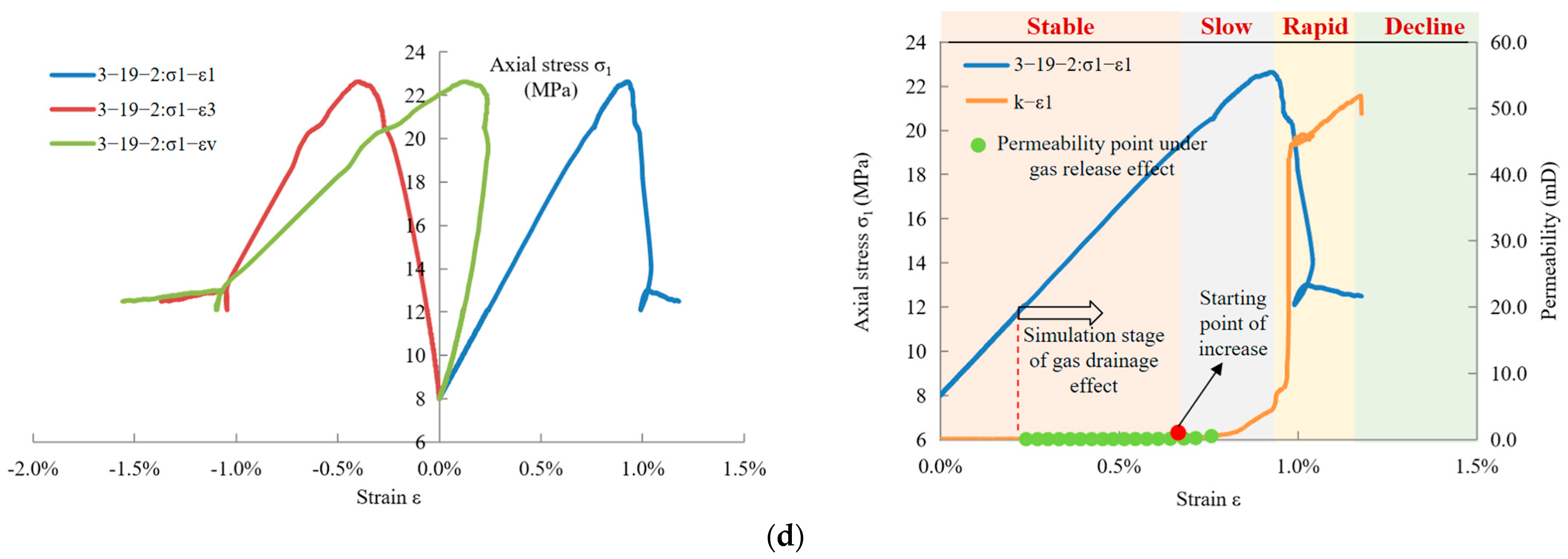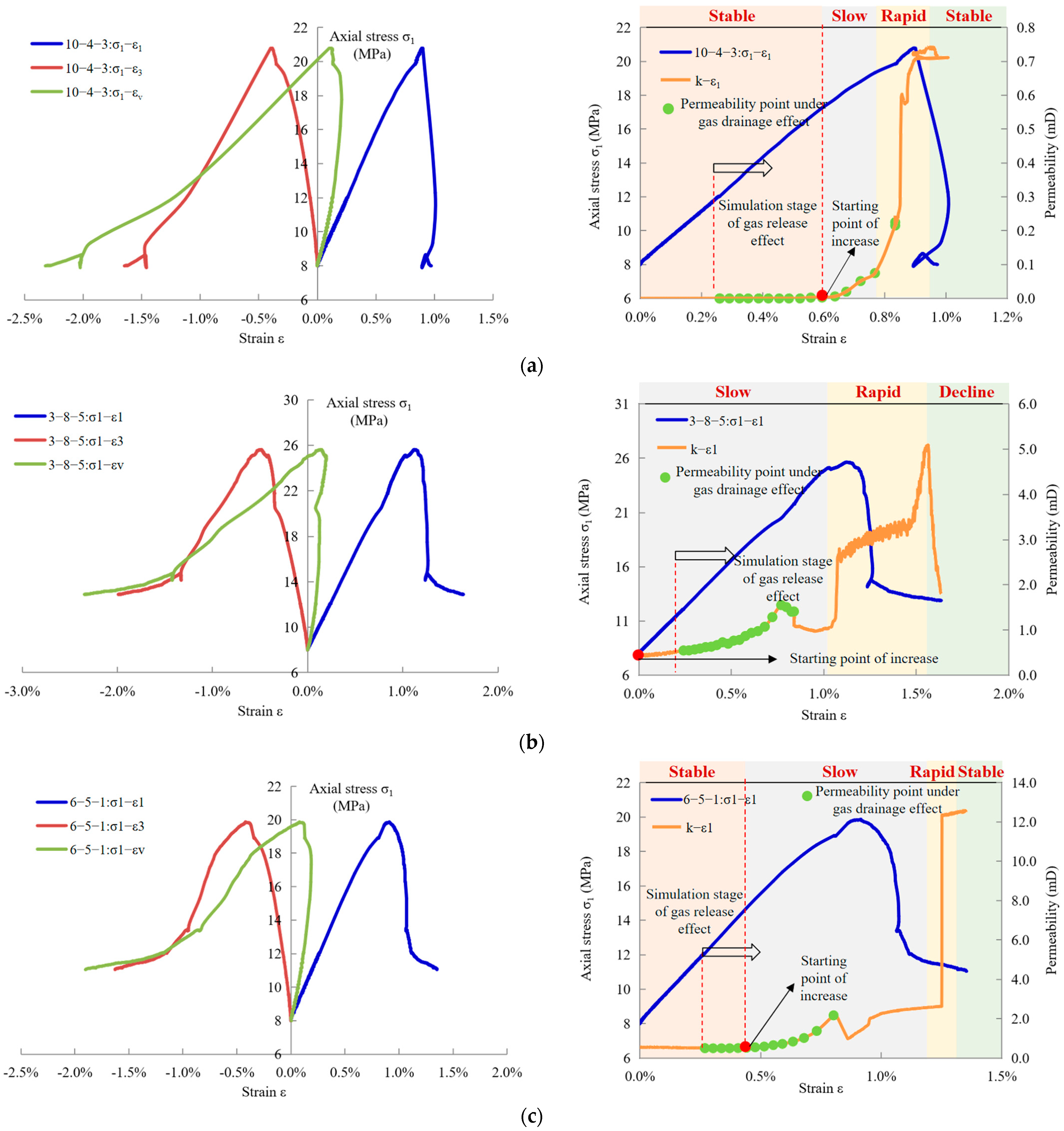- Experimental results indicate that the onset of permeability enhancement in fractured coal occurs primarily during the stage of gas release simulation. The combined influence of mining-induced stress relief and gas desorption significantly accelerates the permeability growth rate, confirming the strong coupling between mechanical disturbance and gas flow behavior.