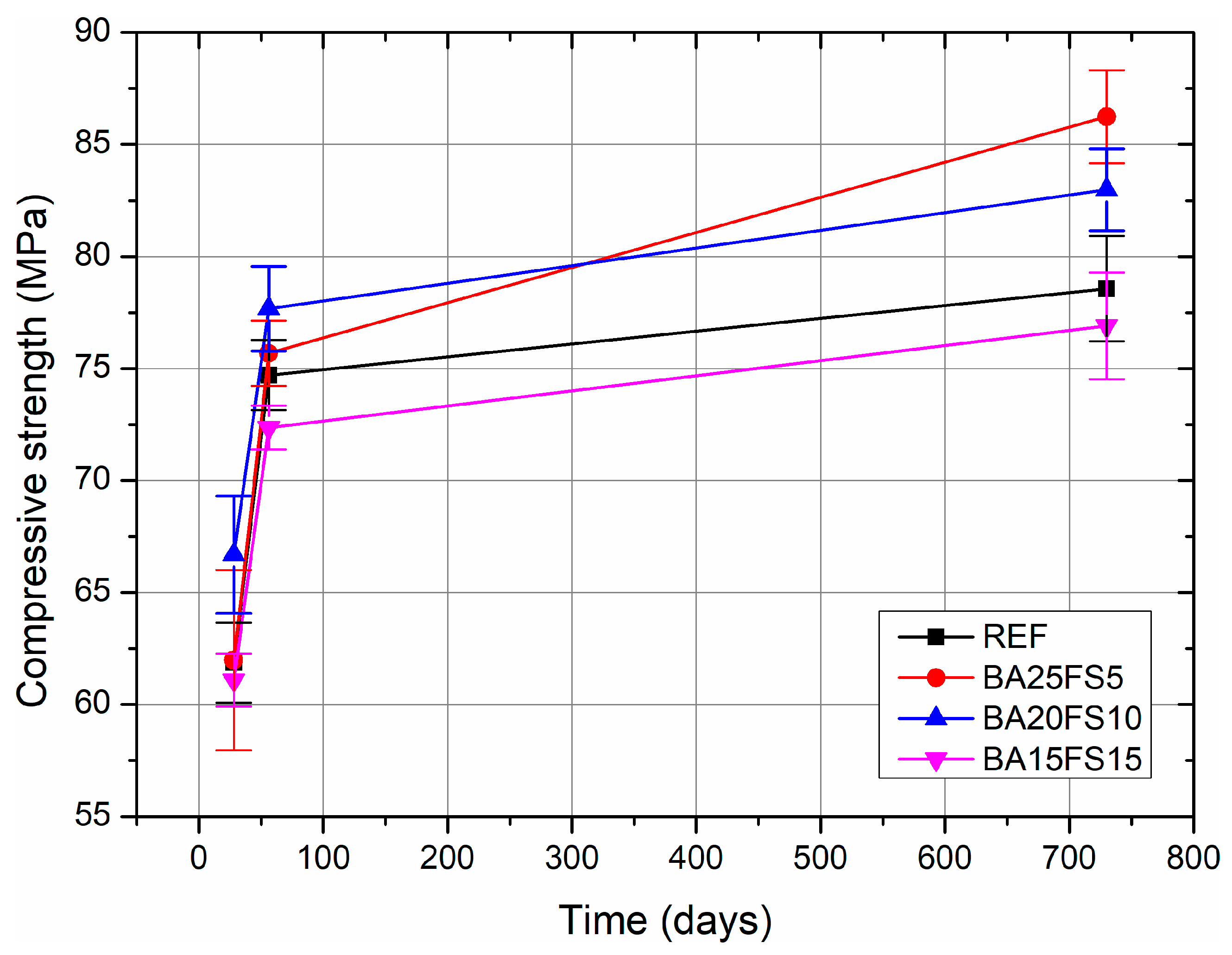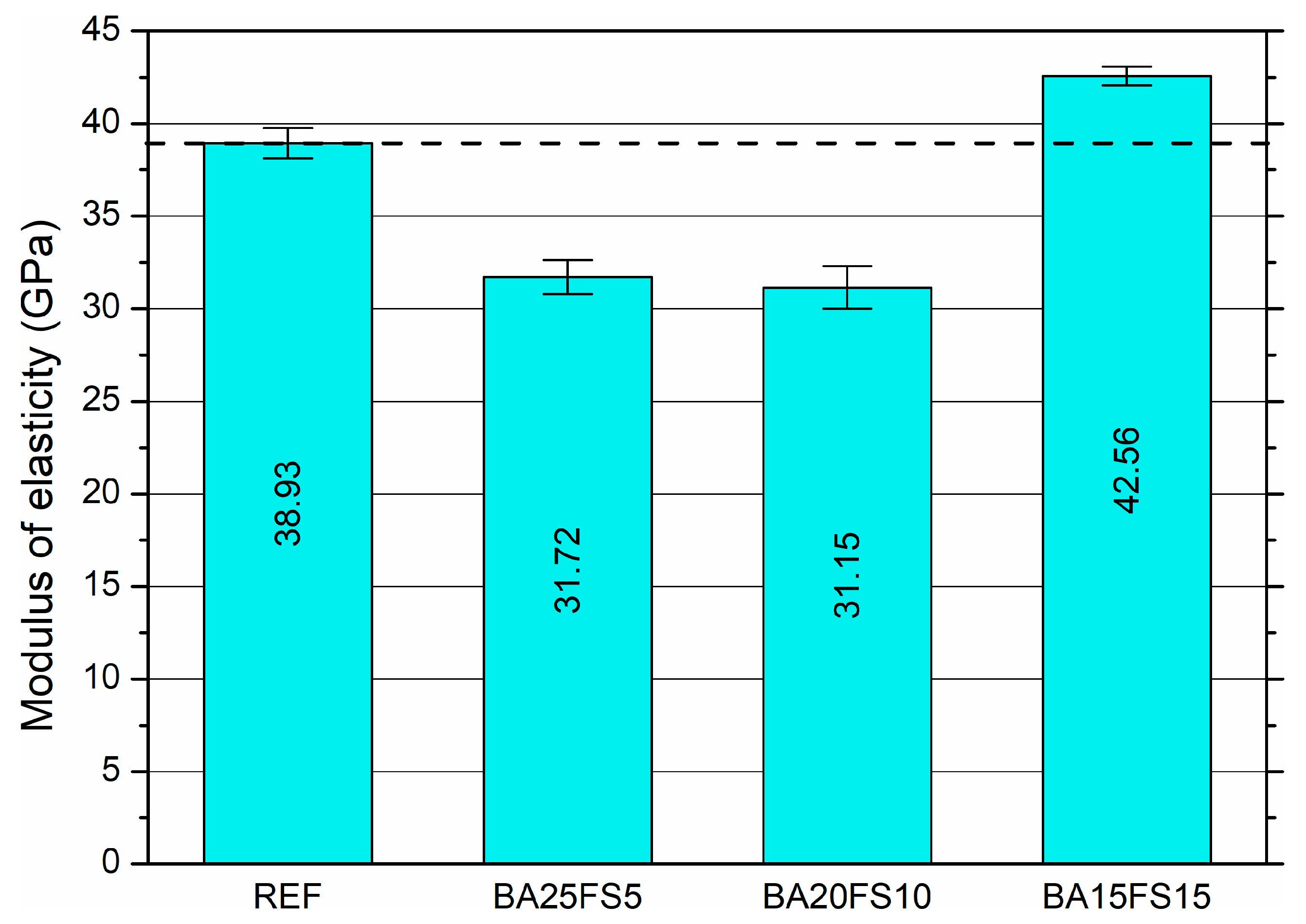 - Mechanical behavior demonstrated that moderate CBA–WFS substitution maintained or slightly improved compressive strength over time, while the BA15FS15 mixture achieved the highest elastic modulus due to enhanced matrix continuity and ITZ integrity.