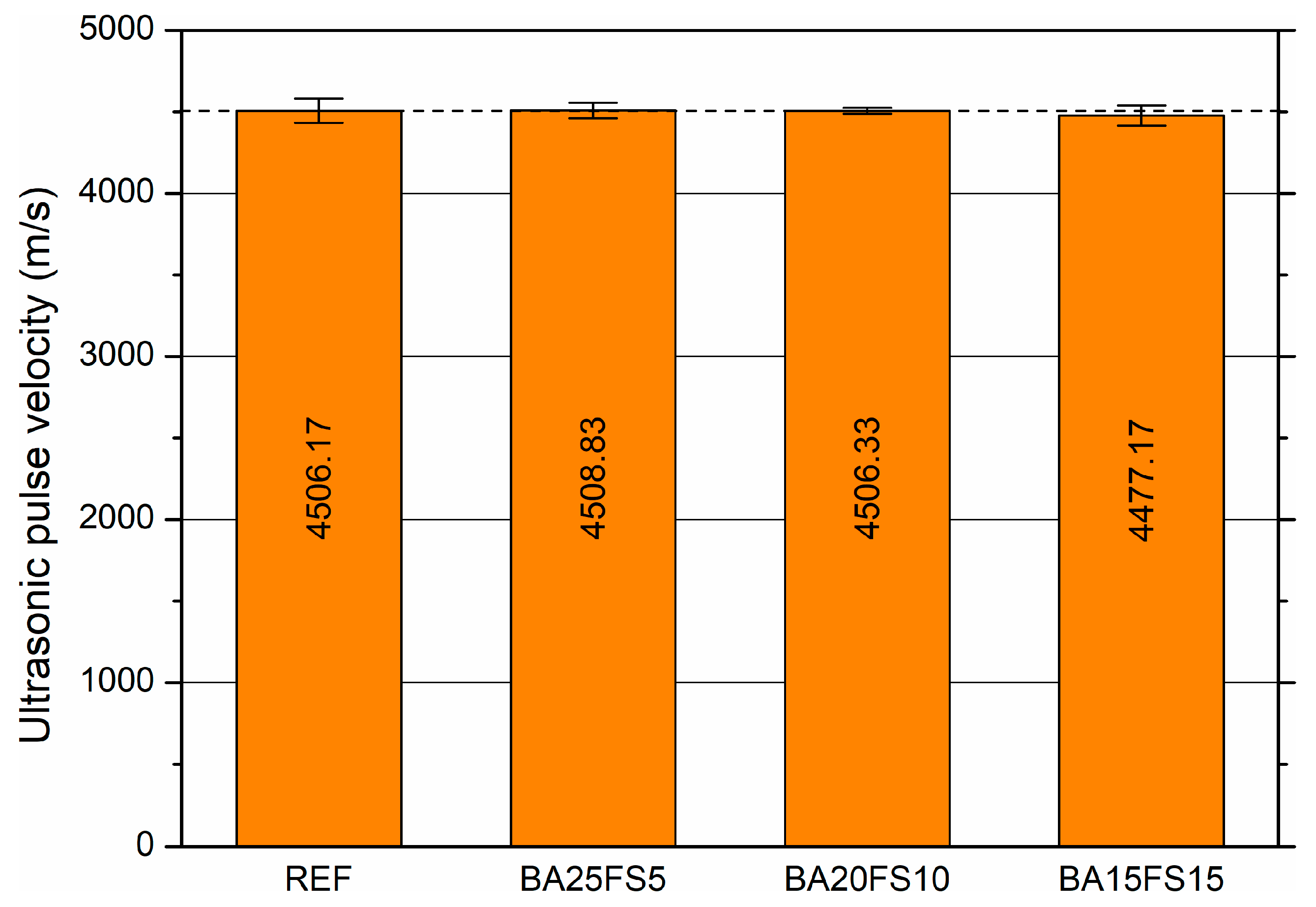 - Empirical model validation showed strong correlations between compressive strength, porosity, density, and ultrasonic velocity, as well as consistency with classical modulus–strength relationships. The derived models accurately describe the mechanical response of CBA–WFS concretes within experimental uncertainty.