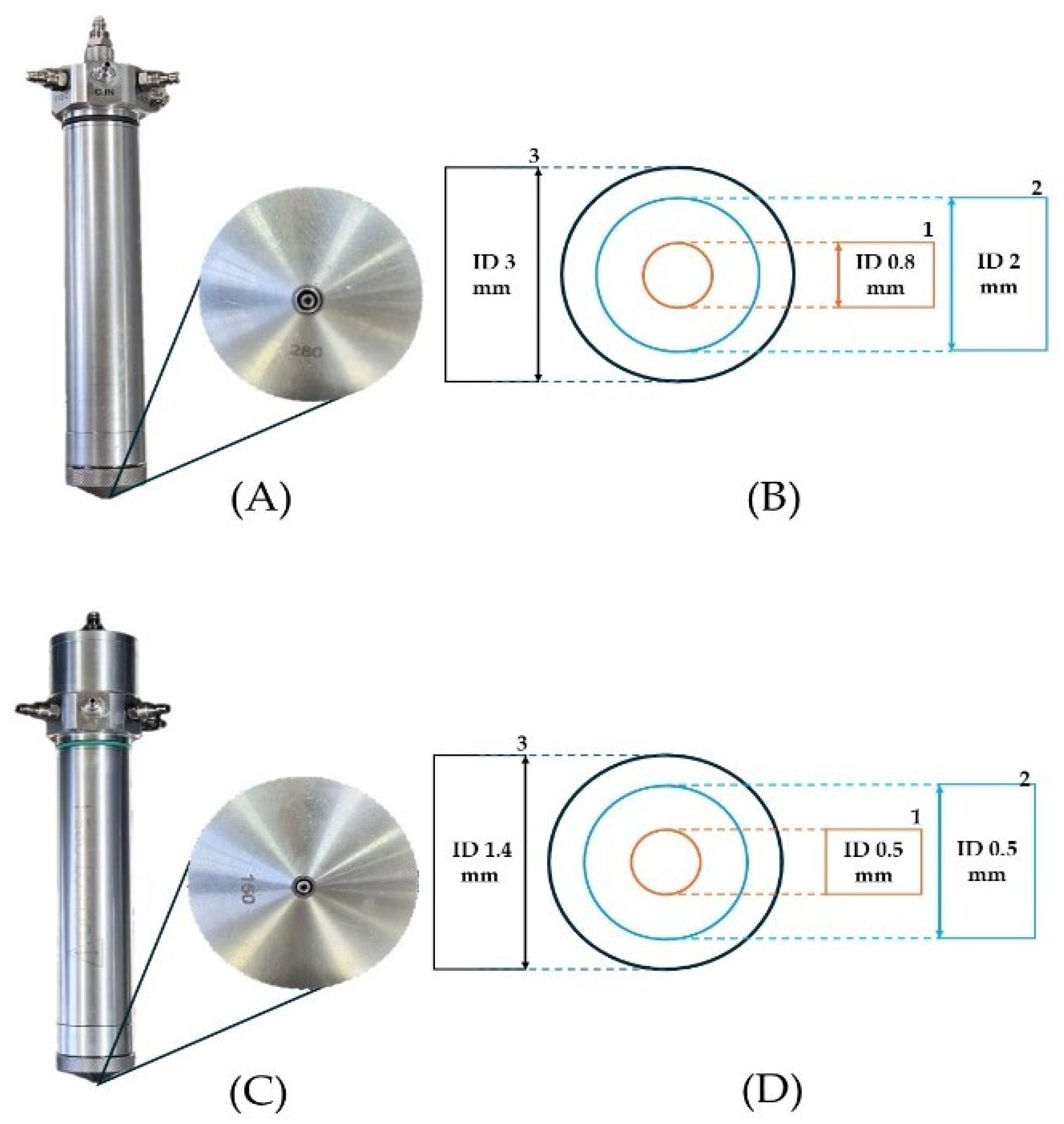 - Höhne, S.; Taboada, M.L.; Schröder, J.; Gomez, C.; Karbstein, H.P.; Gaukel, V. Influence of Nozzle Geometry and Scale-Up on Oil Droplet Breakup in the Atomization Step during Spray Drying of Emulsions. Fluids 2024, 9, 70. [Google Scholar] [CrossRef]