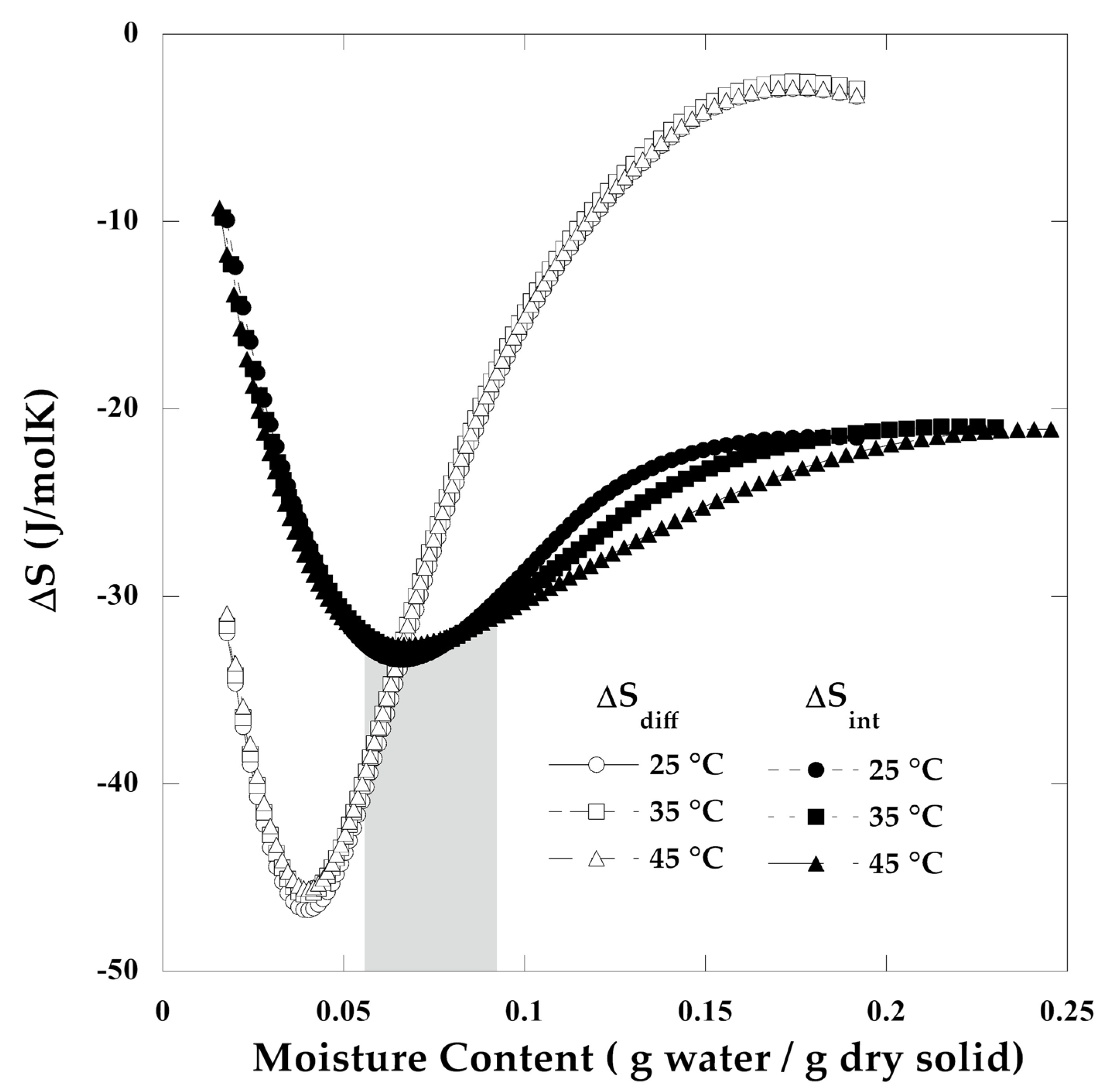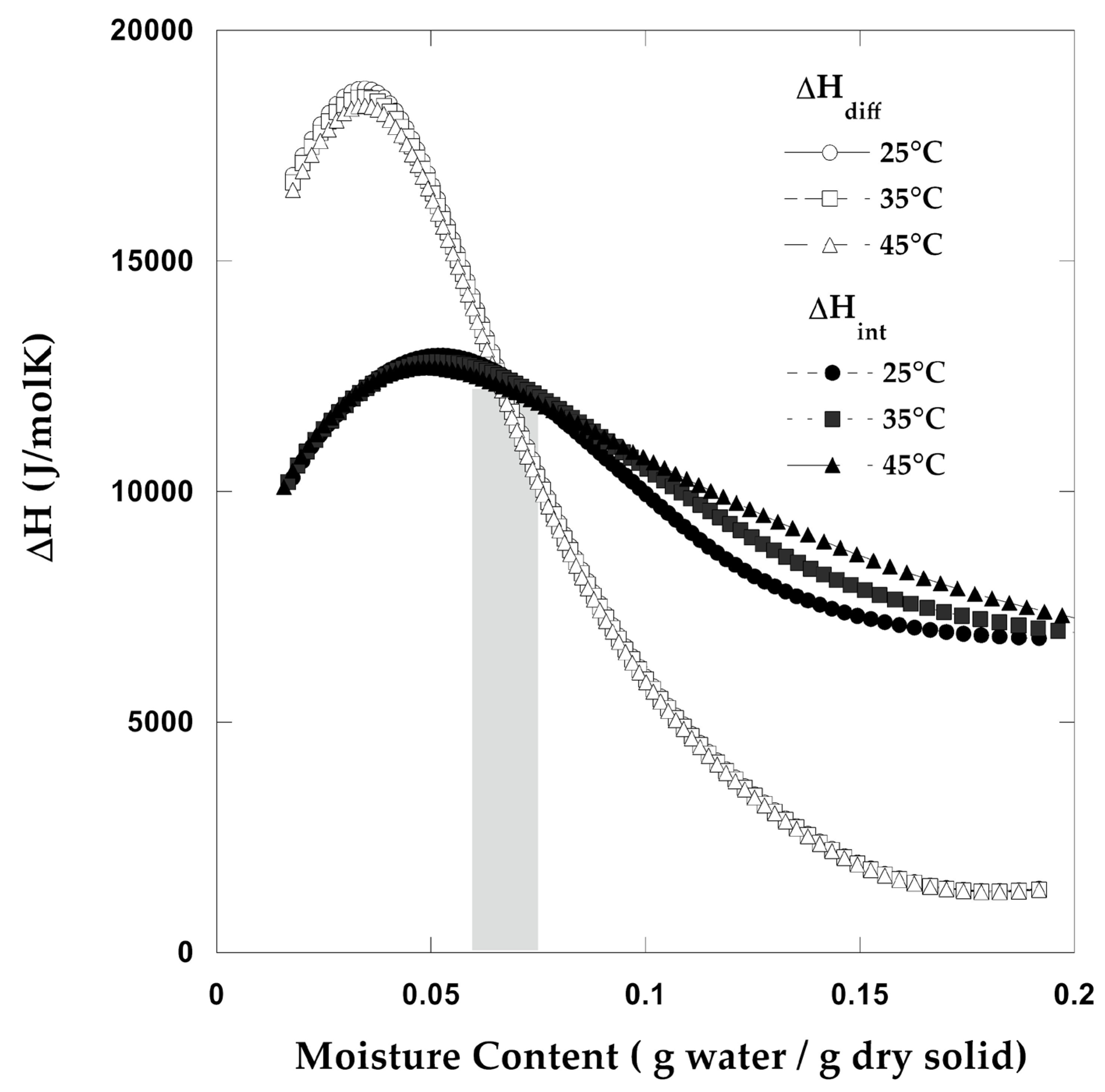 - Beristain, C.I.; Garcia, H.S.; Azuara, E. Enthalpy-Entropy Compensation in Food Vapor Adsorption. J. Food Eng. 1996, 30, 405–415. [Google Scholar] [CrossRef]