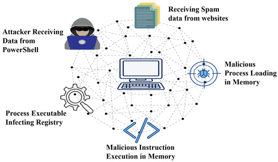 In-memory malware operates by injecting malicious code into system memory, often leveraging legitimate tools such as “PowerShell” and “Windows Management Instrumentation (WMI)”. Since it leaves no traces in persistent storage, its detection requires specialized forensic techniques [6,7,8]. In-memory attacks are a subtype of low-observable characteristics (LOC) attacks, a class of group attacks that is difficult to detect. Many LOC attacks leverage PowerShell’s capabilities. The PowerShell uses a command-line shell and associated scripting language, and can grant users accesses to virtually everything and anything in Windows [9]. Figure 1 provides an overview of in-memory malware operation.