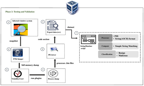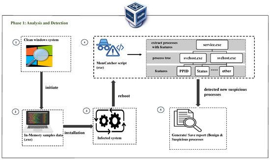 The methodology employed consists of four steps, as illustrated in Figure 2, where the analysis involves setting up a Windows virtual environment using VirtualBox. This environment is used to search for in-memory malware features in potentially malicious processes that persistently run on the system.