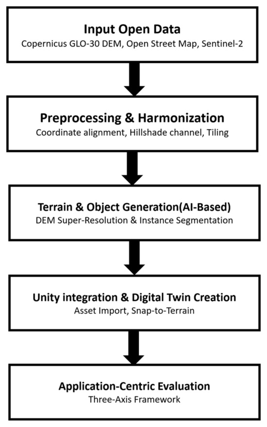 Using this framework, we develop and validate an automated pipeline leveraging open data from COP-30, OpenStreetMap (OSM), and Sentinel-2 [18]. We introduce a three-axis evaluation linking data-level fidelity to Unity in-engine performance [19,20]. To address distributional shift, we diagnose Swin2SR instability and apply lightweight quantile mapping (qmap) stabilization [21,22]. Our contributions are summarized as follows: