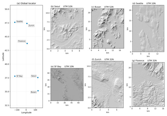 To ensure the robustness of our findings across diverse geomorphological settings, we selected six Regions of Interest (ROIs), including urban, mountainous, and coastal areas Figure 3.
