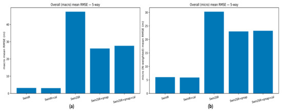 Global average RMSE for the five DEM-SR configurations, showing (a) macro (unweighted) and (b) micro (pixel-weighted) averages.