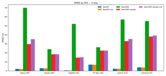 The quantile mapping (qmap) stabilization was introduced not as a production alternative to SwinIR—which (as Figure 5 confirms) is the more robust choice—but as a diagnostic remedy. By successfully mitigating failure modes (reducing macro RMSE by 45%), qmap proves that Swin2SR’s failure was due to a correctable distributional shift, not a fundamental architectural flaw. This diagnostic analysis provides the analytical justification for selecting the demonstrably stable SwinIR (+cal) model for deployment.