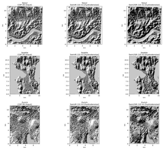 However, applying our proposed qmap stabilization technique dramatically rectified this issue, reducing Swin2SR’s macro RMSE by 45.0% to 26.062 m. This demonstrates that qmap is decisive in restoring the practical viability of Swin2SR for DEM data.