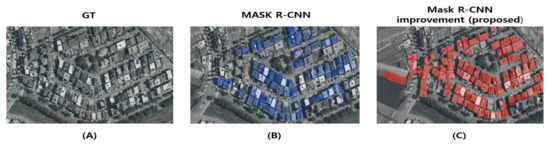 Comparison of Building Extraction Results ((A) Ground Truth (GT), (B) Mask R-CNN Baseline, (C) Proposed Mask R-CNN Improvement).