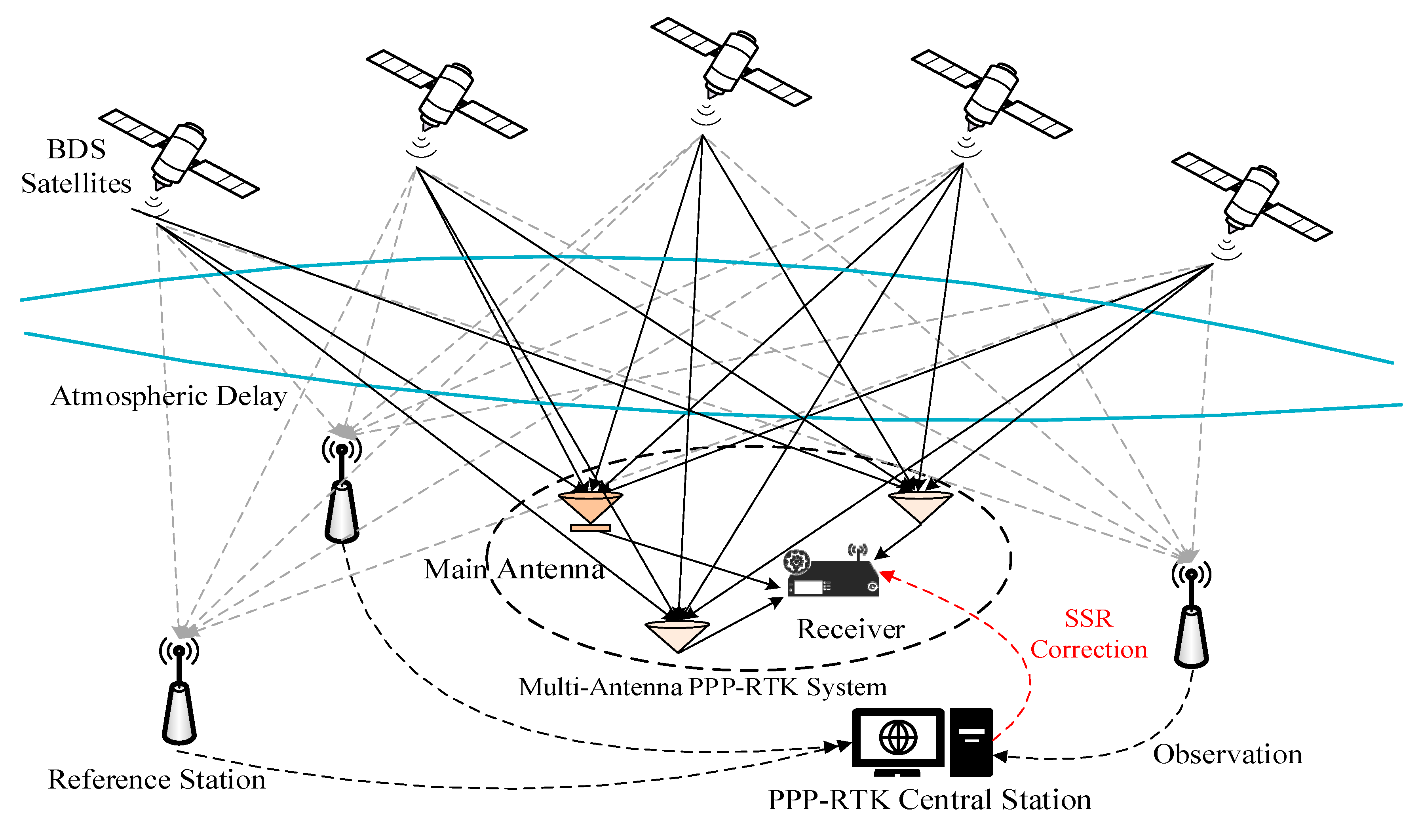 10]. This technology requires a multi-antenna BDS receiver system and state-space representation correction data streams. By precisely measuring the relative positions of the antenna array within the carrier platform, it offers two key advantages: (1) it enables direct or global positioning information acquisition, and (2) it enhances the redundancy of BDS observations, thereby effectively shortening convergence time and improving resistance to signal reflection interference.