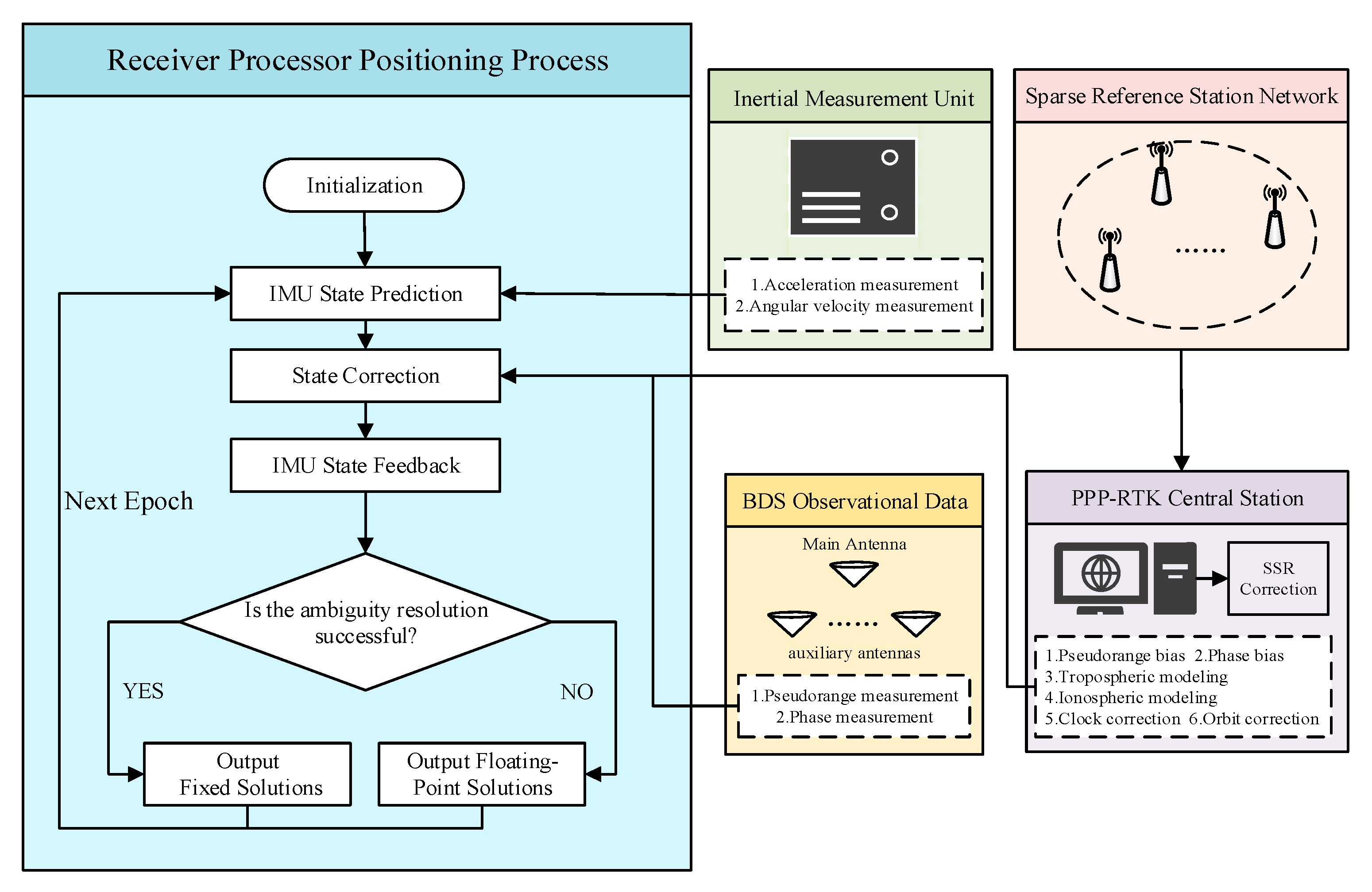 The proposed PPP-RTK technique is a recursive motion estimation algorithm that integrates multi-antenna BDS system data with IMU measurements. As illustrated in