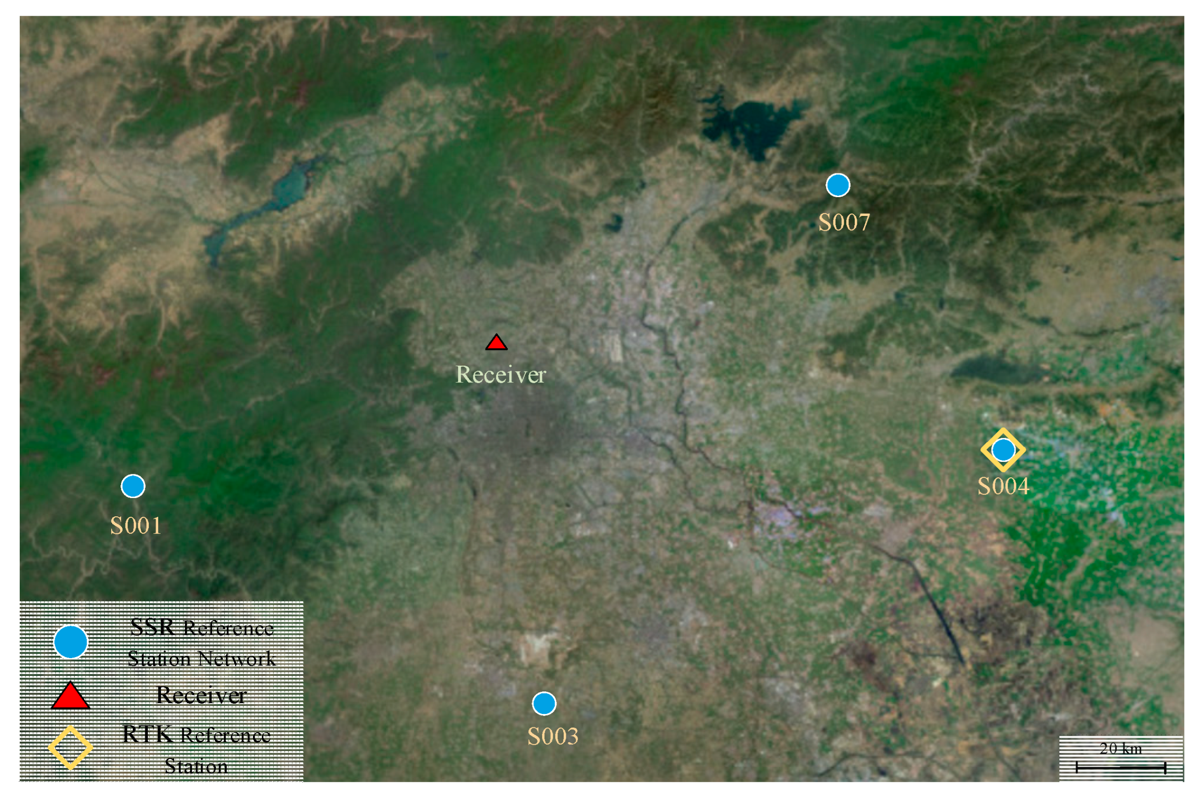 Figure 3, these SSR products were generated through collaborative processing from three sparsely distributed reference stations around the campus. These stations collected multi-antenna BDS observation data over 24 h, with regional atmospheric products being resolved through PPP technology.