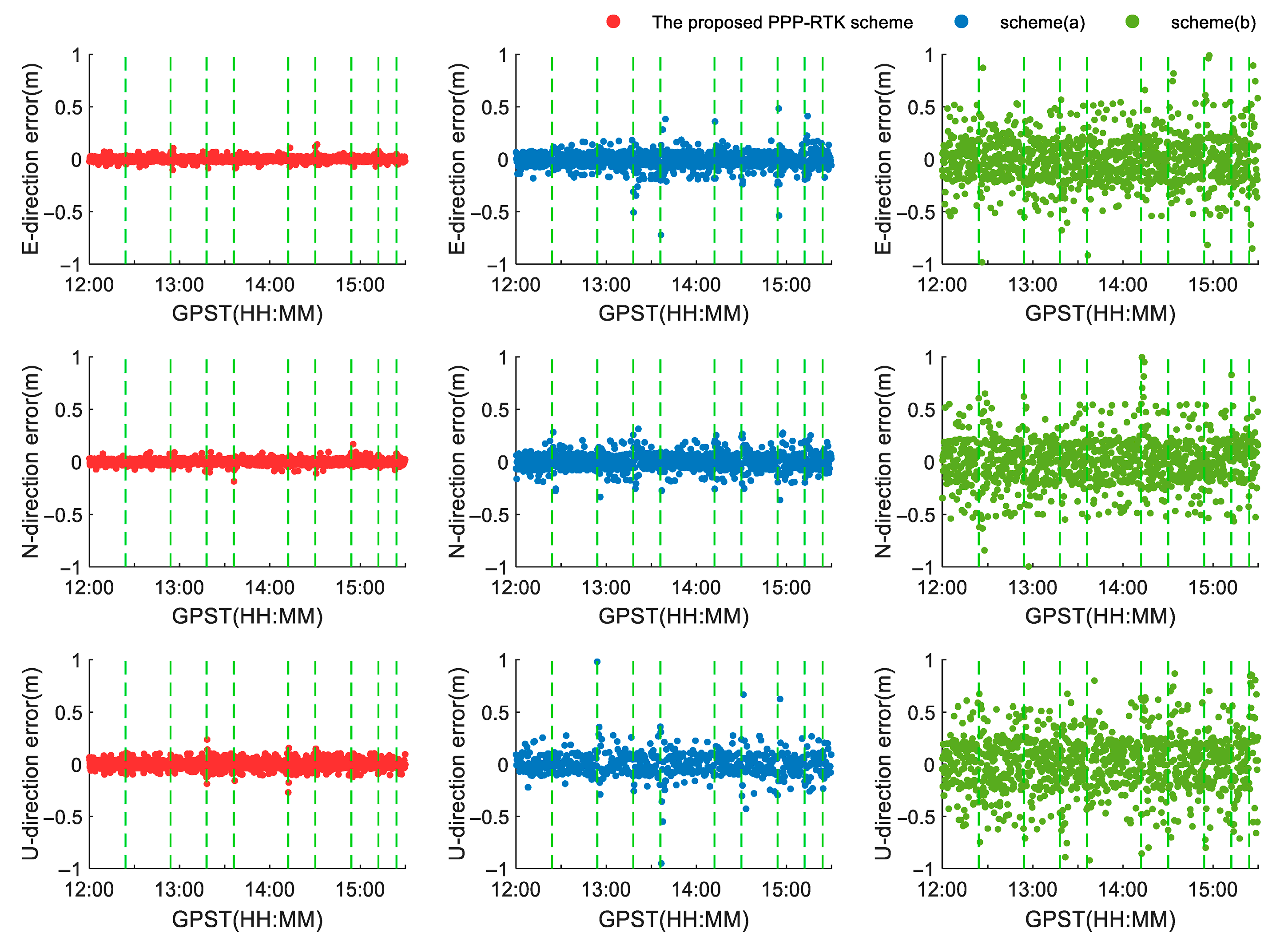 Figure 4, which presents the positioning errors in East, North, and Up (ENU) directions for three positioning schemes when the receiver is fixed at a reference station in a sparse open area, the proposed scheme (red) demonstrates significant improvements over scheme (a) (blue) and scheme (b) (green) across six 30-min observation intervals. The results show that, except for isolated intervals, the proposed scheme achieves markedly enhanced positioning accuracy and superior stability compared to scheme (a).