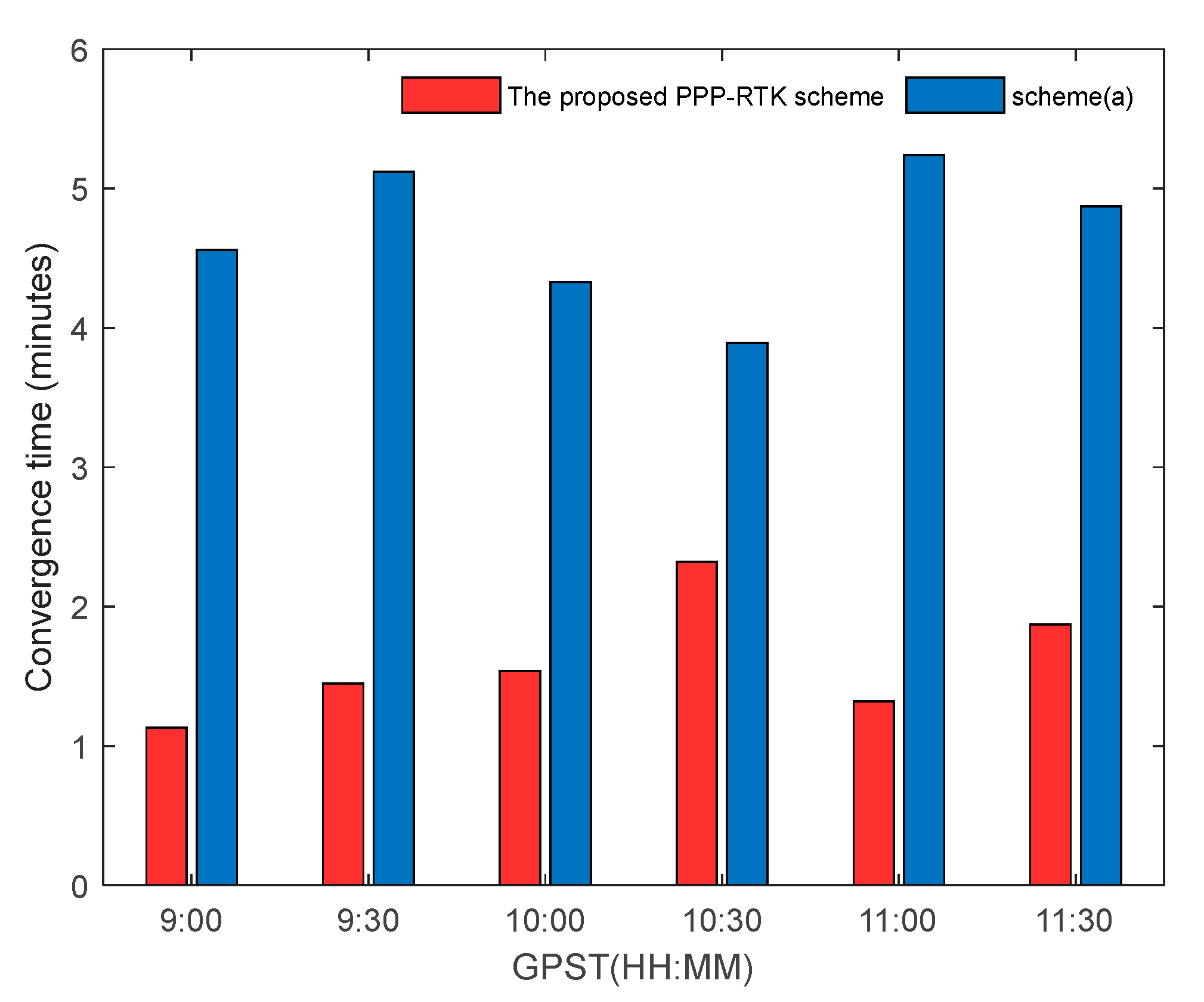 Many application scenarios require the system to achieve rapid convergence within minutes. Therefore, besides positioning accuracy, convergence time is also considered another critical metric for evaluating the performance of a positioning scheme. This paper defines convergence time as the duration starting when the horizontal positioning error first falls below 0.05 m and remains continuously below this threshold for a sustained period.