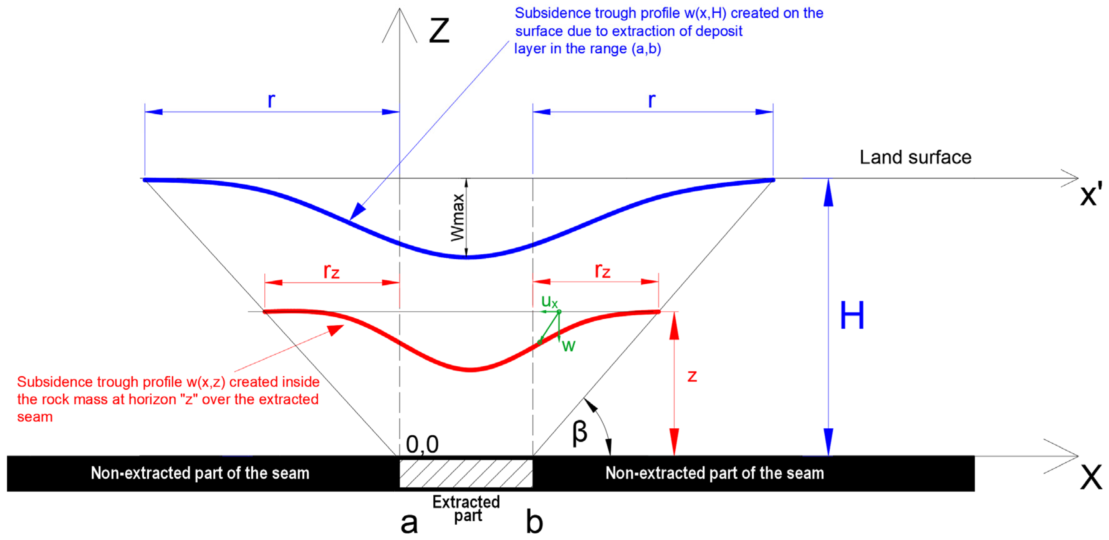 - Lin, S.; Whittaker, B.N.; Reddish, D.J. Application of Asymmetrical Influence Functions for Subsidence Prediction of Gently Inclined Seam Extractions. Int. J. Rock Mech. Min. Sci. Geomech. Abstr. 1992, 29, 479–490. [Google Scholar] [CrossRef]