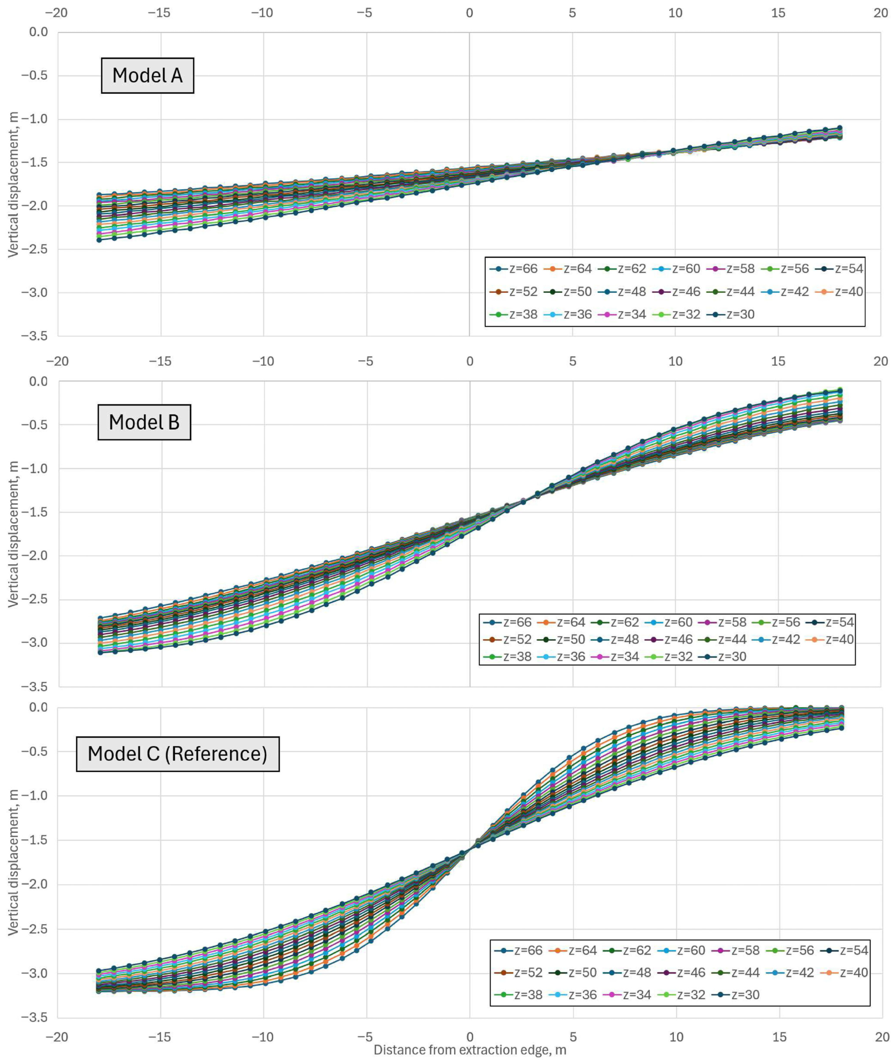 - Cross-section Plots: Displaying vertical displacements along the profile for all Z-levels for direct comparison between the models A, B and the reference model C (Figure 11).