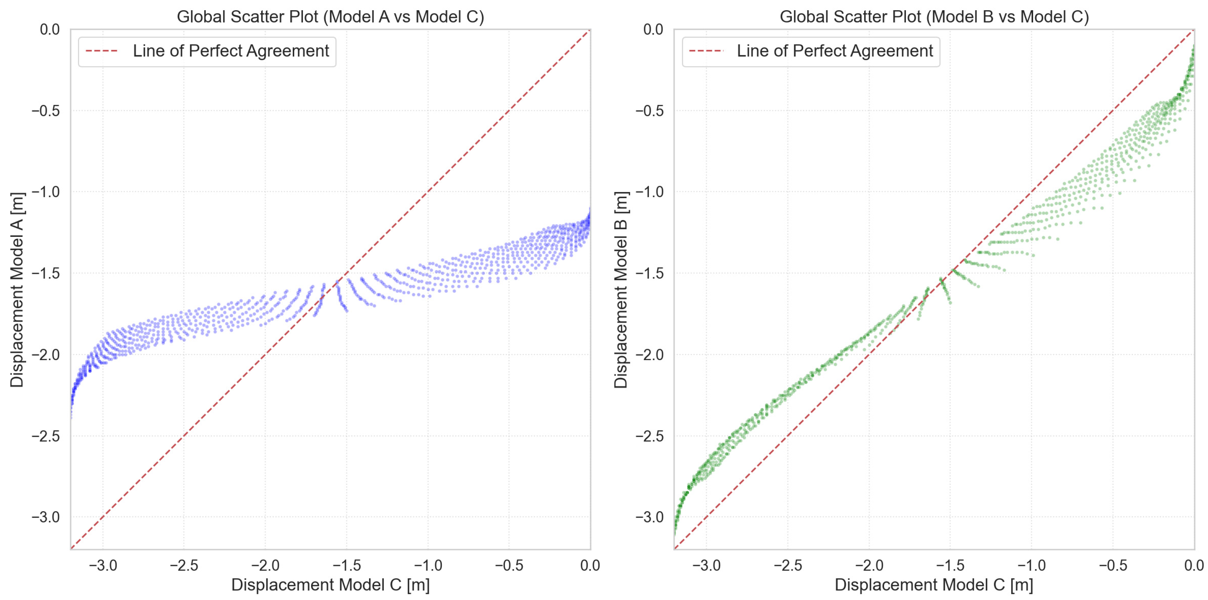 - Scatter Plots: Illustrating the correlation between predicted and reference displacements, with a line of perfect agreement (y = x) for visual assessment of bias and scatter (Figure 12).