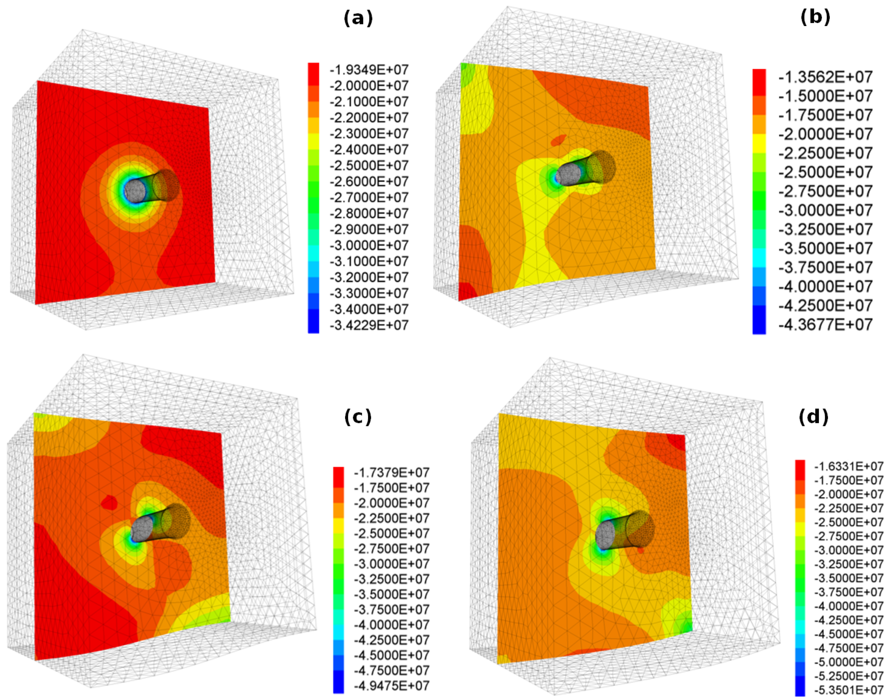 - For the rock mass, an elasto-plastic model with Coulomb–Mohr strength criterion was applied, with the following parameters: bulk modulus = 66.7 MPa, shear modulus = 40.0 MPa, cohesion = 5 MPa, friction angle = 45°, density = 2500 kg/m3.