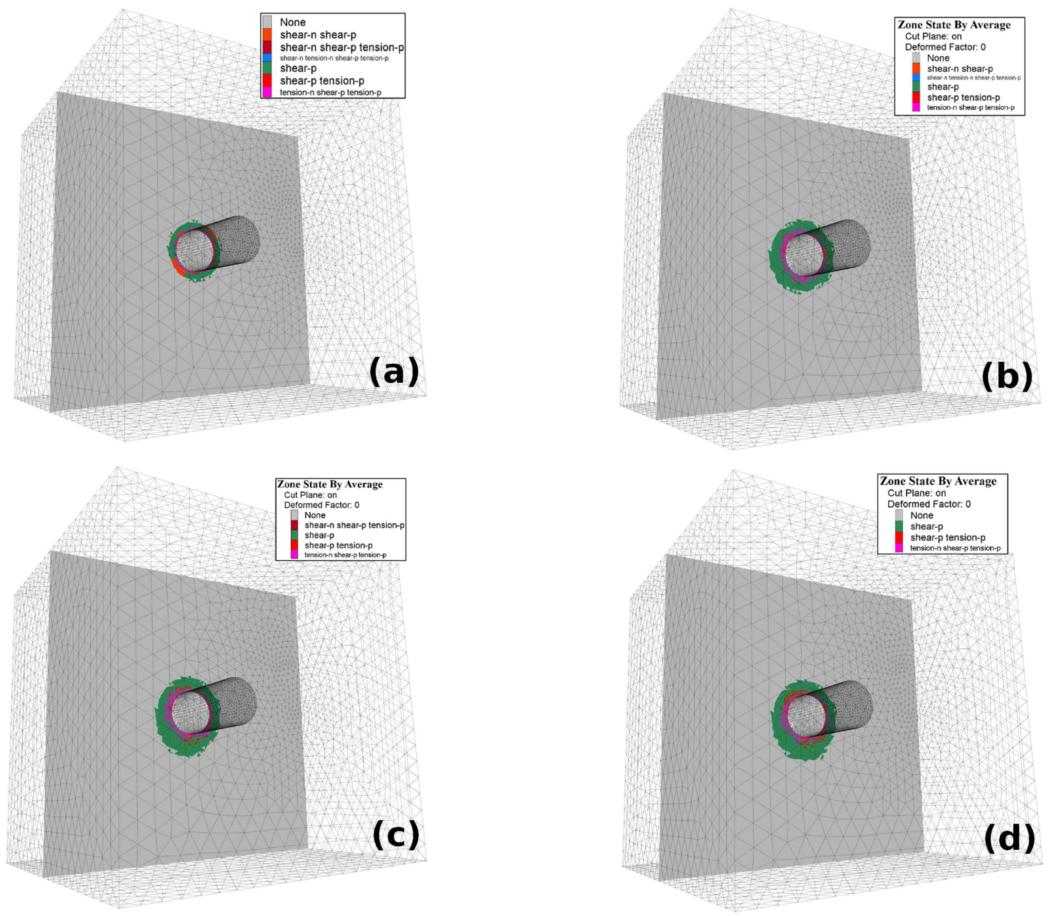 - Computational efficiency: The hybrid approach substantially reduces computational demand. Model B required nearly ten times fewer finite difference zones than Model A, resulting in over an order-of-magnitude shorter computation times across all tested constitutive models, including elastic, elasto-plastic, and elasto-plastic with softening. This efficiency enables rapid multi-scenario analyses, which are critical in practical engineering design and risk assessment.