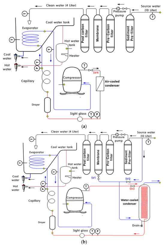 All components except the water-cooled condenser were from commercially available water purifiers. For a comparative analysis of the water-cooled and air-cooled condensers, they were connected in parallel, and their operating modes were switched via a solenoid valve system. Solenoid valve SV4 induced fluid flow through the air-cooled condenser (Figure 1a), and SV3 induced fluid flow through the water-cooled unit (Figure 1b). When operating in water-cooled mode, SV1 supplied RO effluent as the cooling medium. When RO effluent was unavailable, SV2 operated to supply tap water to maintain a constant thermal environment.