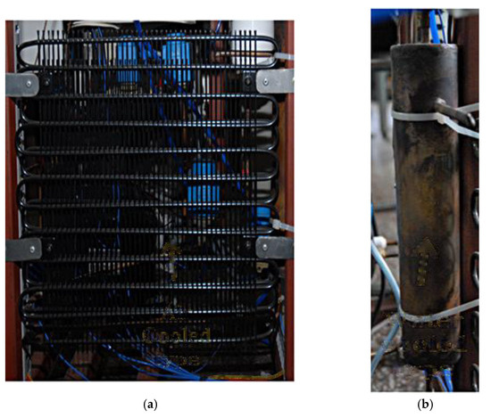 External view of the two condenser configurations used in the experiment: (a) air-cooled condenser and (b) water-cooled condenser.