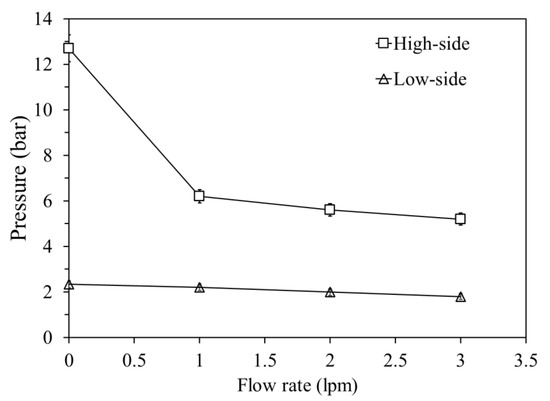 Figure 4 shows the pressure trends as a function of the RO effluent flow rate in the high- and low-pressure sections of the refrigeration cycle. As heat transfer within the condenser increases, the condensing pressure decreases, leading to a decrease in compressor discharge pressure. This phenomenon has been widely reported in vapor compression systems, where improving condenser heat transfer efficiency effectively lowers the refrigerant saturation pressure and reduces compressor work input, thereby improving the overall system’s COP [25,26]. This decrease benefits compressor power consumption, further contributing to improved COP. However, the continued decrease in evaporating pressure due to this effect can reduce both the evaporating temperature and the refrigerant flow rate, potentially reducing cooling capacity. While this issue can be mitigated by optimizing the heat exchanger design and refrigerant charge, this study primarily focuses on evaluating the performance improvement achieved through drop-in replacement of a water-cooled condenser.