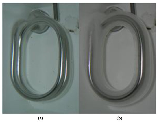 An experimental system was constructed to evaluate the performance of a residential hot-and-cold water purifier incorporating a vapor compression refrigeration cycle (Figure 1). This system utilizes a hermetic compressor (1/10 hp) filled with R134a refrigerant. The refrigeration loop consists of a compressor, condenser, capillary tube, and evaporator, which were all connected by copper piping. The condenser is a wire-tube type air-cooled heat exchanger. It provides a total frontal surface area of about 300 cm2, and it is designed to operate under natural convection conditions without forced airflow. The inner diameter of the capillary is 0.6 mm, and its total length is 1.2 m. The evaporator is a coil-type heat exchanger immersed directly in the cool water storage tank of the purifier. It consists of a pipe with an outer diameter of 9.5 mm and a total length of 0.9 m arranged in a spiral pattern to maximize surface contact with water. After evacuation, the system is charged with a refrigerant and operates in a closed loop while the compressor is running. The refrigerant is drawn into the compressor as a low-pressure vapor, compressed, and discharged as a high-pressure, high-temperature gas. It then flows into the condenser for heat dissipation and phase change. The high-pressure liquid refrigerant expands as it passes through the capillary tube, becoming a low-pressure, low-temperature liquid. It then enters the evaporator, absorbing heat from the water in the water purifier’s cold-water container. The refrigerant then evaporates and returns to the compressor inlet as a low-temperature, low-pressure vapor, completing the cycle.